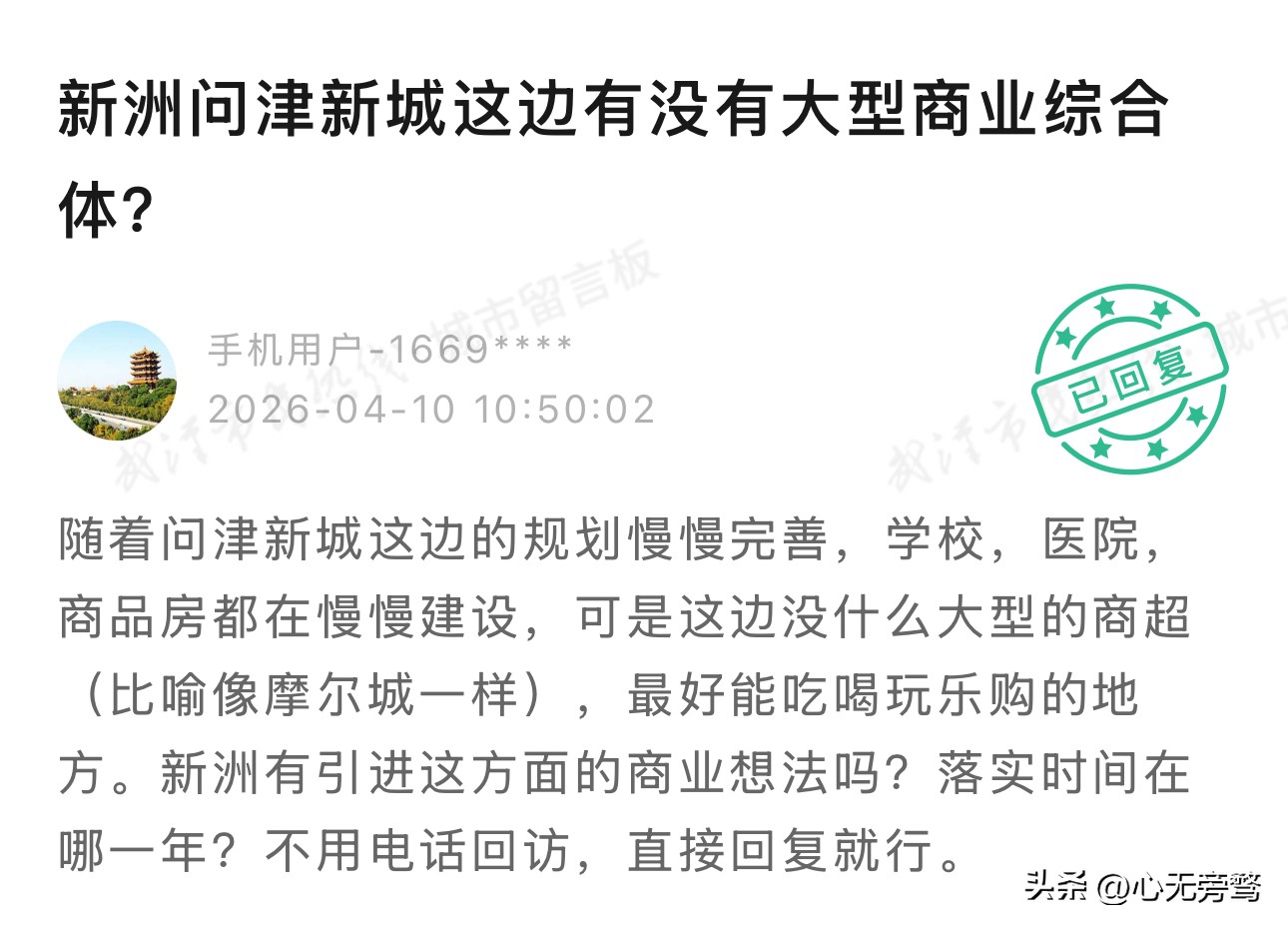 近日,有关心新洲问津新城发展的网友咨询商业引进计划,新洲区商务局回复称:经查,为完善问津新城城市功能,满足群众娱乐购物一站式消费需求,我区已将大型商业综合体项目纳入新城整体规划布局,正积极对接王府井、永旺等国内知名商业品牌及优质商业运营企业,全力推进招商引资工作。目前相关商业项目洽谈与选址工作正有序开展,待项目正式签约落地后,将第一时间向社会公布建设计划与投用时间。