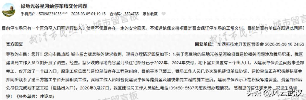 该网友称:目前停车场只有一个直角窄入口可进行出入,使用不便且存在一定的安全隐患,不知道该保交楼项目是否会保证停车场的正常交付,目前是否有单位在跟进此问题?