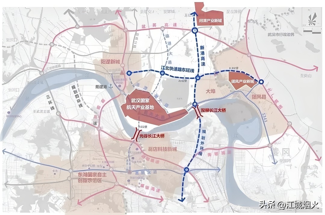 这座桥建在阳逻长江大桥下游10公里、双柳长江大桥上游15公里,北岸连着新洲航天基地(星谷),南岸对接光谷科创大走廊,建成后能直接打通两大国家级产业片区的交通壁垒。