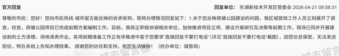 对此,东湖新技术开发区管委会最新回复:经查,荷塘公园项目已完成前期方案编制工作。目前,我局正积极协调相关单位,加快推进项目立项、建设方案研究及决策等前期工作,现场已同步开展建设前的土方清理、场地清表作业,各项前期准备工作正有序推进中。