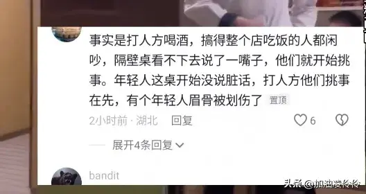 据视频拍摄者表示:穿着蓝色衣服的几人喝酒,被邻桌说了一嘴后就开始挑事,邻桌的有一个年轻人眉骨被划伤了。