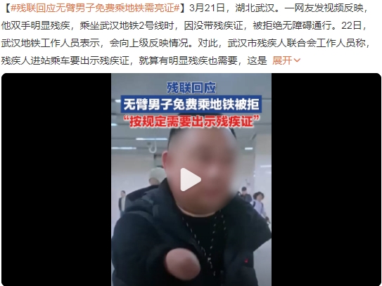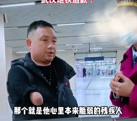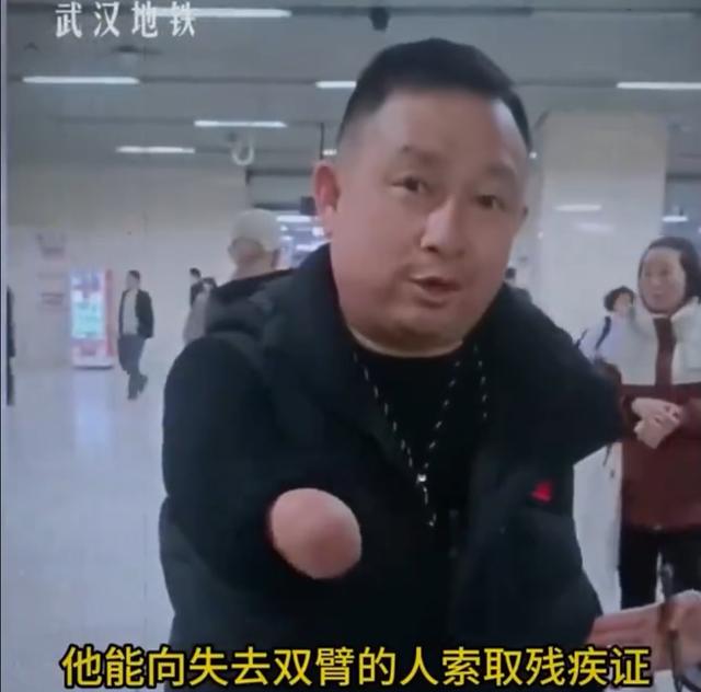 近日,失去双臂的残疾人李先生在武汉乘坐地铁走无障碍免费通道时,与工作人员发生争执。李先生认为自己没有双臂,难道残疾的还不明显吗? 忘带残疾证也应享受免费。但是,地铁工作人员也有自己的道理,称规定上写得十分清楚:“残疾人出示残疾证后才可放行”。最后李先生不得已买了正常票才放行。李先生的同伴将这段现场视频发布到网上后,瞬间引发网友热议。