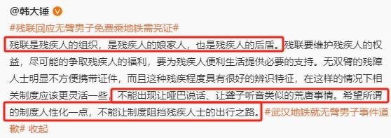 知名博主“韩大锤”直言,残联本是残疾人的组织,是残疾人的娘家人,是残疾人的后盾,应该维护残疾人的权益,无臂残疾人没有带证,但在如此明显的情况下,应该更灵活一些,希望所谓的制度能够更人性化,不能让制度成为阻挡残疾人的出行之路。