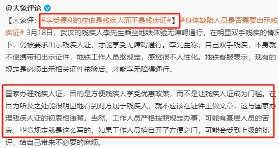 很多网友建议,实际上这些年类似的事件不止一次了,每次事件都暴露出一些规定的死板和僵化,建议将必须出示残疾证,更改成:“有明显残疾的残障人士可直接无障碍通行,而对于残疾不太容易观察的残障人士,需展示残疾证明”。