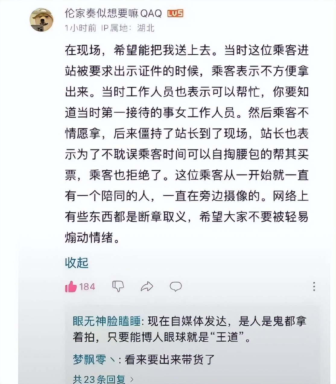 另外,还有自称当时就在现场,亲眼目睹这件事情的网友表示,最开始,这位乘客被要求出示证件时,他告诉工作人员不方便拿。
