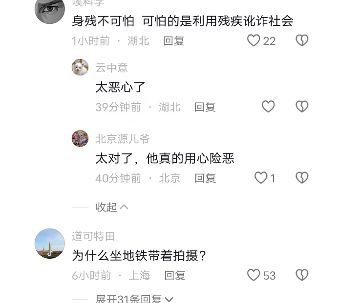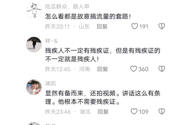 有网友发现,那条视频是残疾男子的同行人员拍摄的,因此怀疑整件事情就是为了炒作。