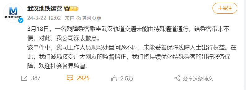 没多久,武汉地铁官方账号发文致歉,表示会持续优化特殊乘客的出行服务保障。