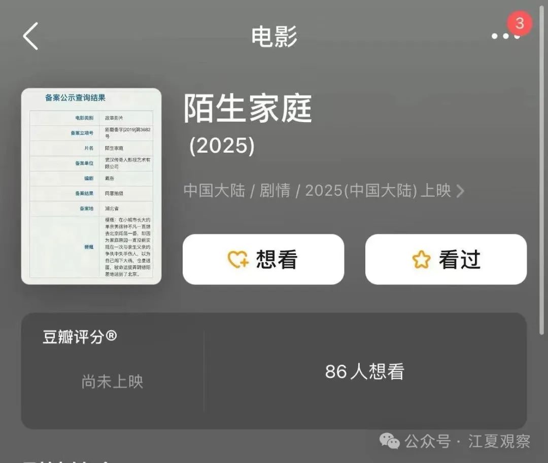记者从网络平台以及豆瓣等影视剧平台发现,2025年由成龙主演的电影《陌生家庭》正在武汉市江夏区拍摄,也有市民们发布帖子声称在江夏区偶遇过电影拍摄演员。