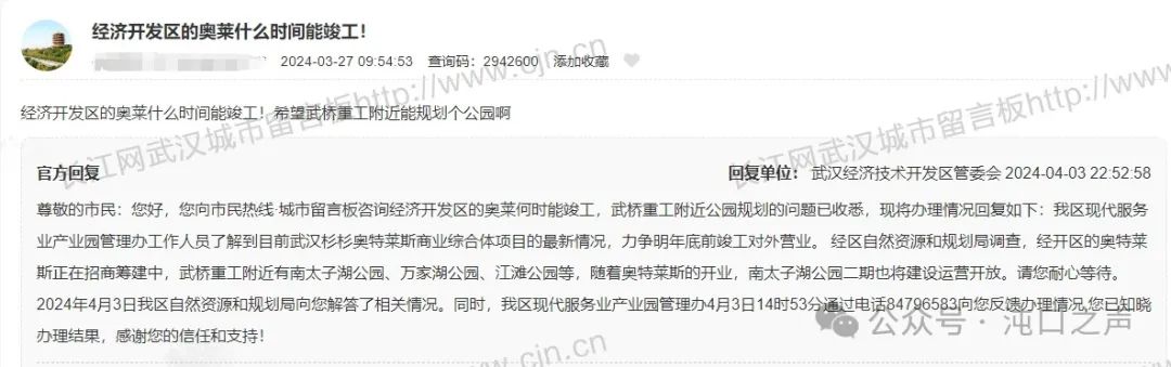 根据官方回复,杉杉奥特莱斯力争明年年底前竣工开业,奥莱开业后,南太子湖公园二期也将建设运营开放。