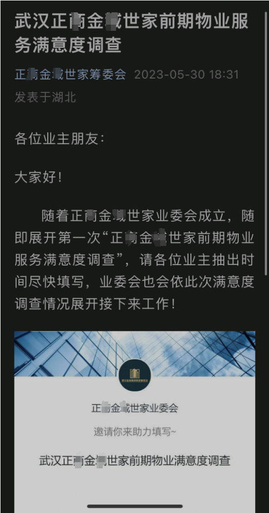 还是在5月30日,业委会发布前期物业满意度调查的线上问卷,明确提出会据此开展接下来的工作。
