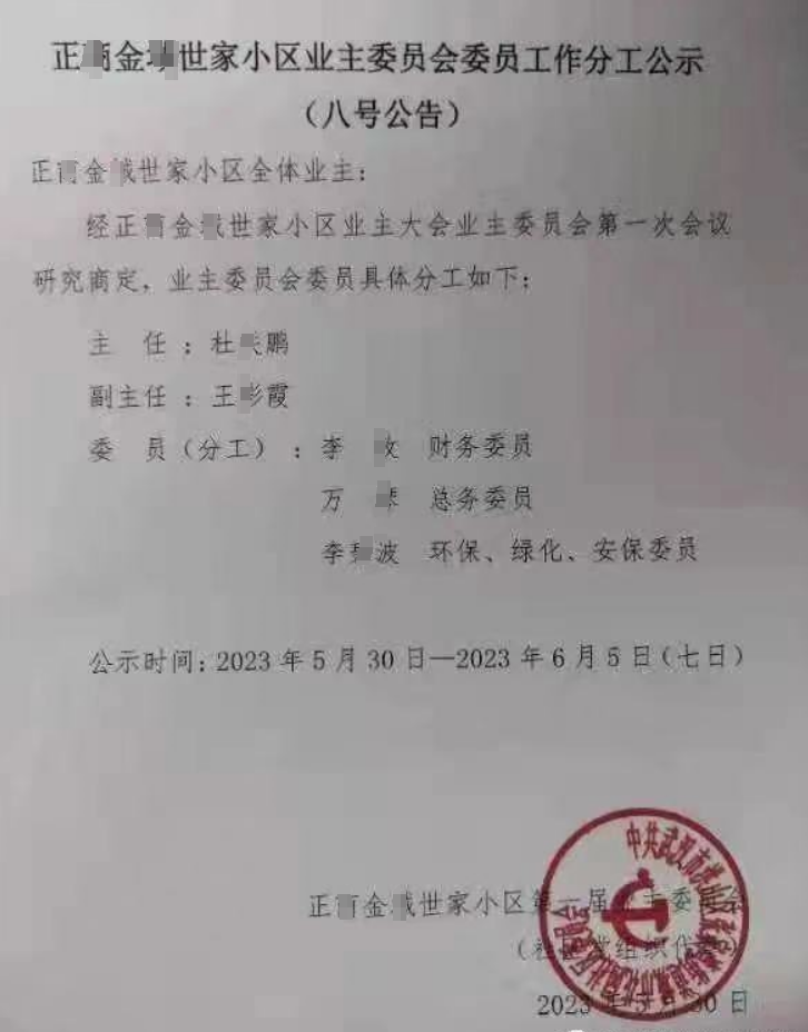 至5月30日,小区发布8号公告,业委会召开首次会议,将业委会成员具体分工进行公示,公示期7天。