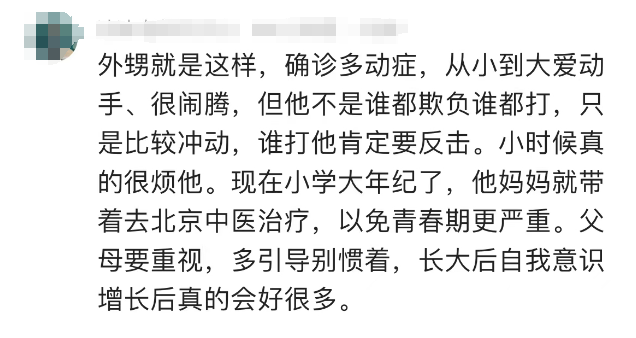 对于多动症孩子被要求转学,蔡晓莉表示,这类孩子其实神经发展较慢,自我控制能力差,因没有重视,以为转学就能解决,“但即使到了新的环境里,还是会继续发生打人的事,长此以往的恶性循环,会让这个孩子认为自己不被社会接受,从而引发更严重的反社会心理。”