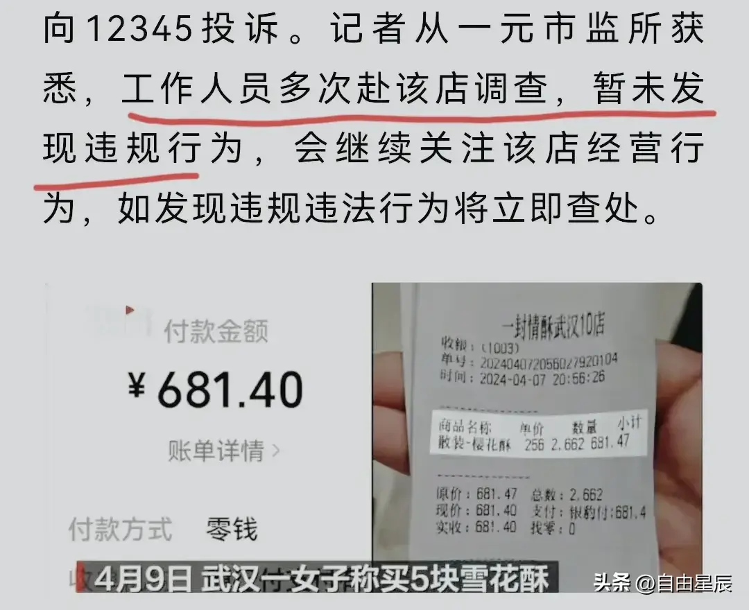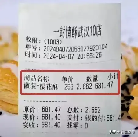 然后大伯就要了5块雪花酥,没想到店员扫码付款时,大伯的手机却显示支付了681.47元。