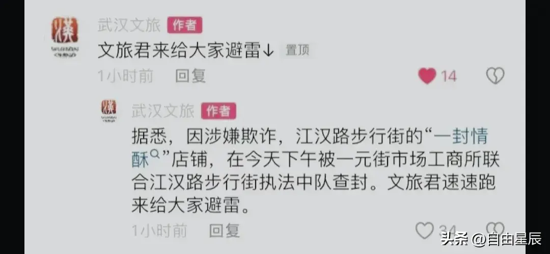 4月10日下午,武汉市文化和旅游局表示,因涉嫌欺诈,汉江路步行街“一封情酥”店铺被查封。