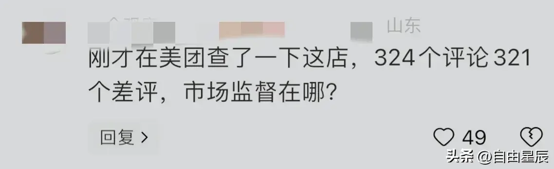 另外,也有网友通过查看美团外卖、大众点评等平台发现,此门店的差评一片,有网友在美团查了一下,一共324个评价,其中321个是差评。