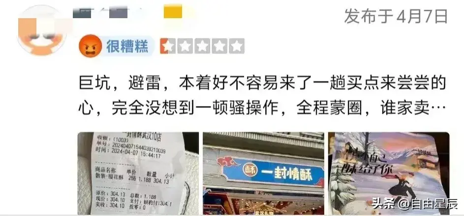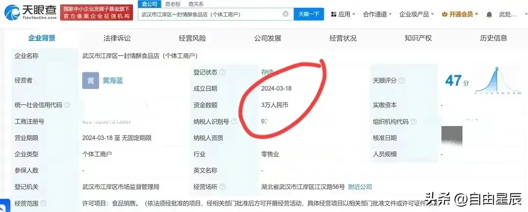 有网友根据天眼查APP查询到,这家“一封情酥”门店成立日期为2024年3月18日,经营者为黄某某,经营范围为食品销售,注册资本3万元,截止到女子投诉,门店成立刚刚20天。