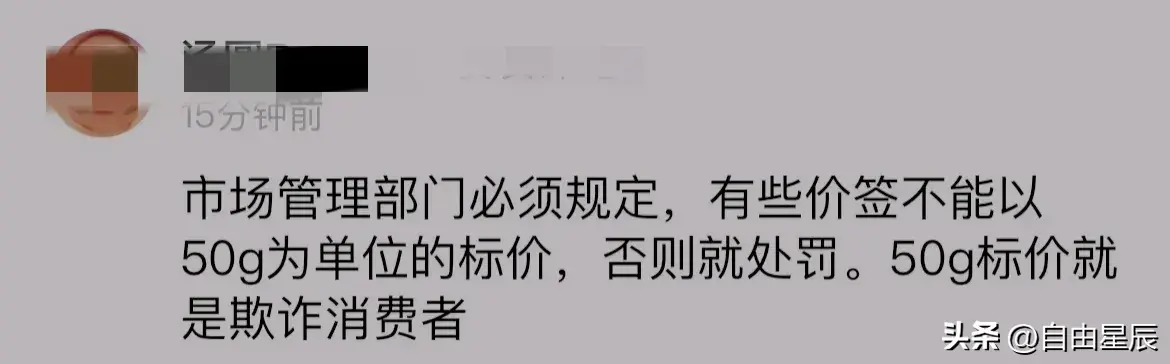 有网友说,市场管理部门必须规定,价格标签就不能以50g为单位标价,否则就处罚,50g标价就是欺骗消费者。