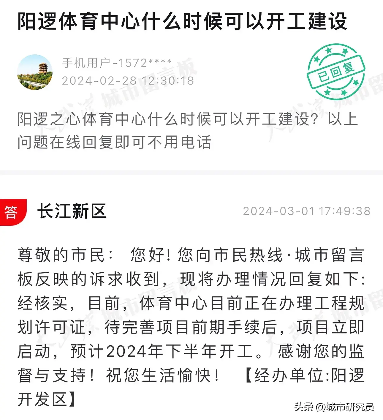 2、2024年3月1日,阳逻开发区在城市留言板官方回复:阳逻之心体育中心项目正在办理工程规划许可证,待完善项目前期手续后,项目立即启动,预计2024年下半年开工。