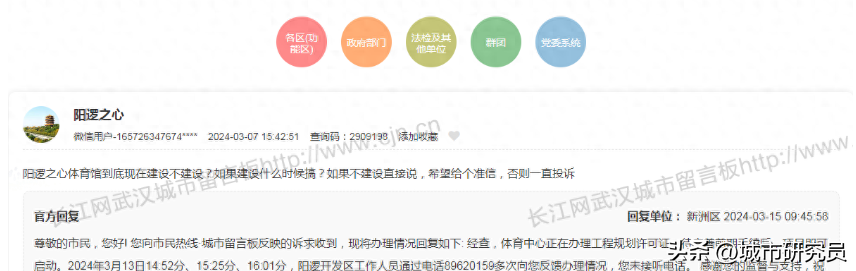 1、2024年3月15日,新洲区曾经在在城市留言板官方回复:经查,体育中心正在办理工程规划许可证,待完善前期手续后,项目即可启动。