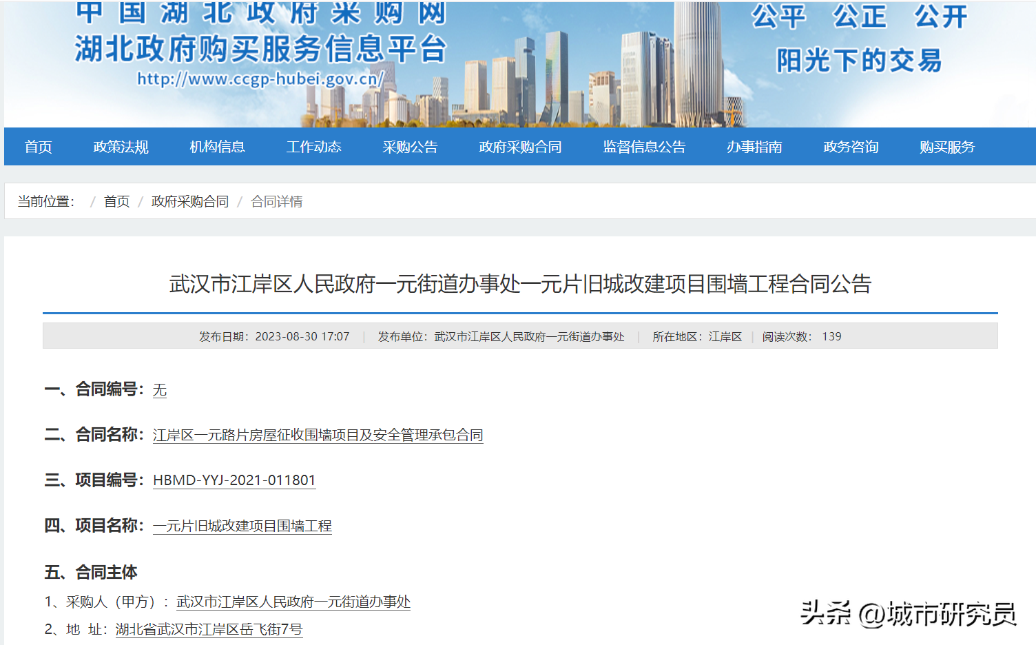 2023年8月15日,湖北政府采购网发布了《武汉市江岸区人民政府一元街道办事处一元片旧城改建项目围墙工程合同公告》: