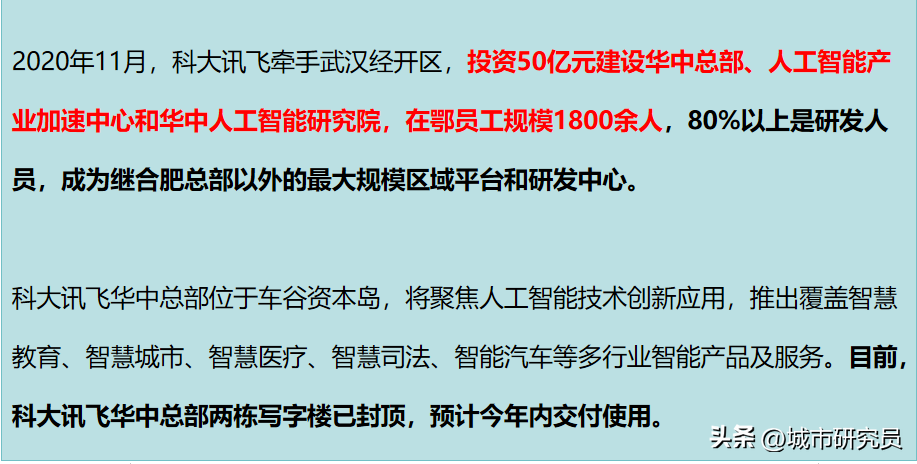 2020年科大讯飞和武汉经开区达成合作,投资50亿在武汉经开区建设华中总部、及华中人工智能研究院,这是继合肥总部之外规模最大的区域平台及研发中心。科大讯飞华中总部位于车谷资本岛,目前,科大讯飞华中总部两栋写字楼已封顶,预计今年内交付使用。武汉“九省通衢的”优越地理位置及强大的经济产业实力,是吸引科大讯飞这世界领先企业把华中区域总部设置在武汉的重要原因。武汉拥有高校92所,两院院士超过80人,全市目前有科研、设计机构355个,其中自然科学研究机构224个,在全国大城市中居第三位,科大讯飞把华中总部定在武汉市,有利于发挥武汉市的人才技术优势,推动人工智能进一步向前发展。