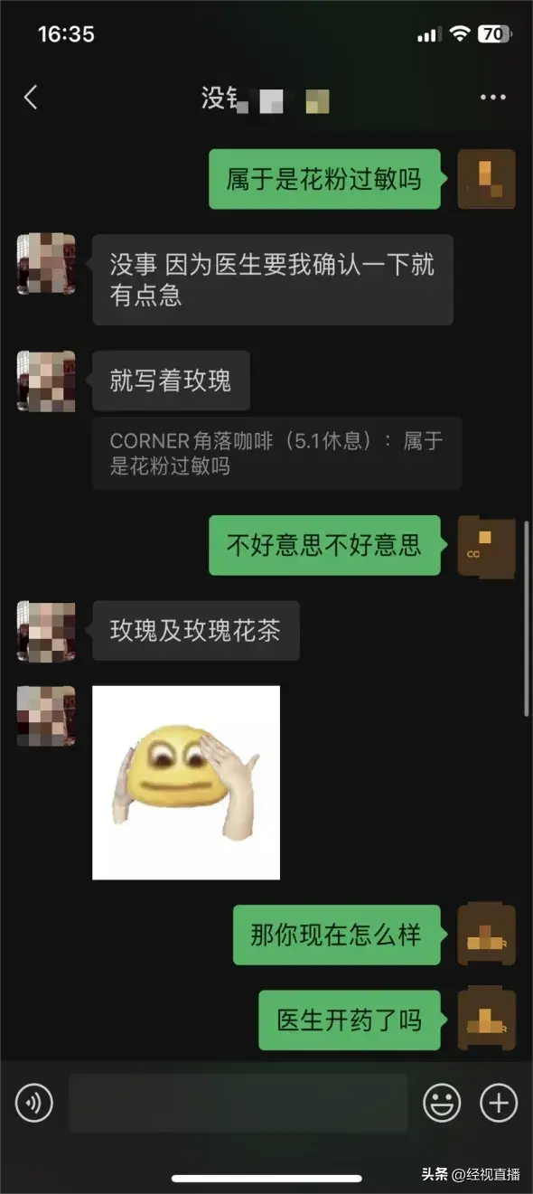随后,经视直播记者又采访了CORNER角落咖啡店和Landing咖啡店,角落咖啡店老板徐女士告诉记者,这位姐姐是4月初来店里,点了一杯开心椰,“这款产品本来售罄了,不做了,她在网上看到有这款产品,说自己跑很远过来就是想喝开心椰,那我就做了。”徐女士说这款咖啡32元,下面是椰子水,上面是开心果奶盖,撒了一些玫瑰花做装饰。第二天这位姐姐打电话过去,说自己喝了这款咖啡后上吐下泻,医生说是玫瑰花过敏。徐女士说自己当时特别紧张,生怕是自己的问题,就跟她说把昨天喝咖啡的钱退还给她。徐女士表示,当时没想太多,今天上网看到好多人跟自己经历一样,感觉受了骗。
