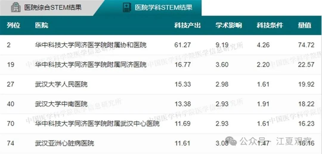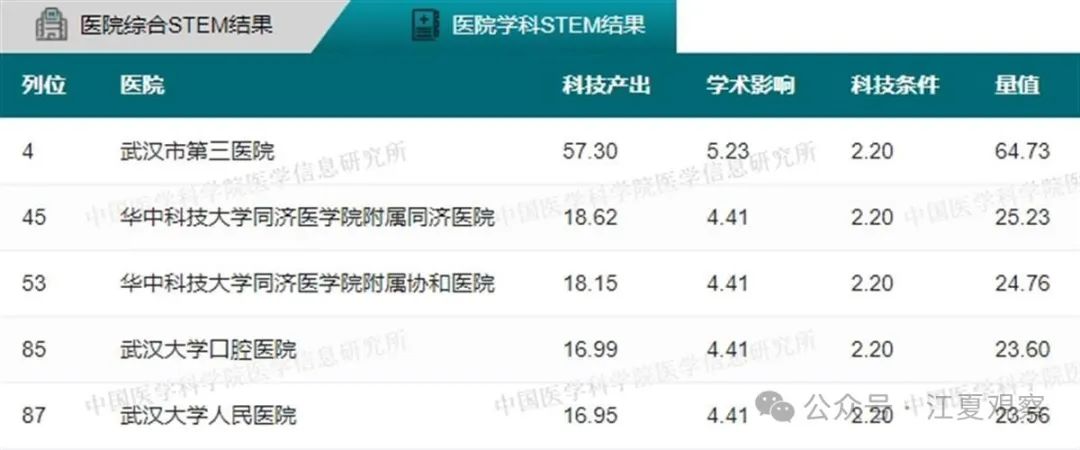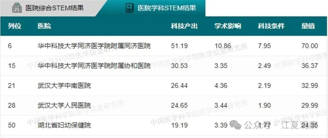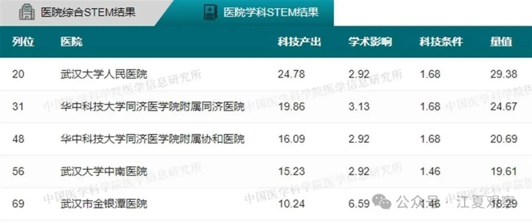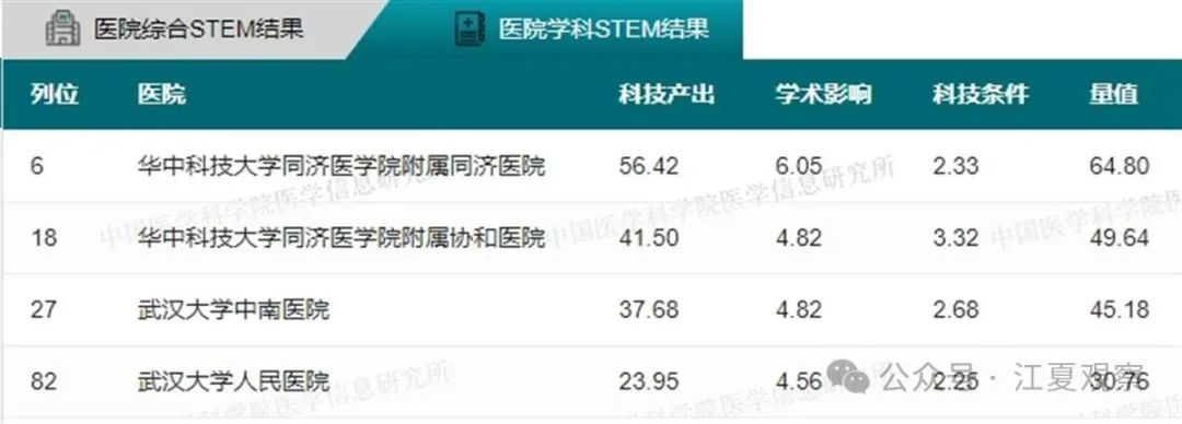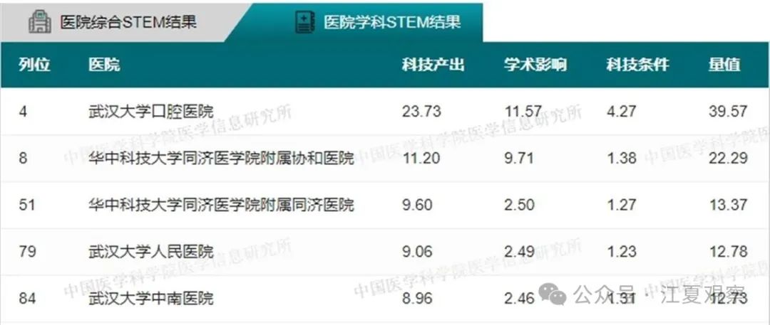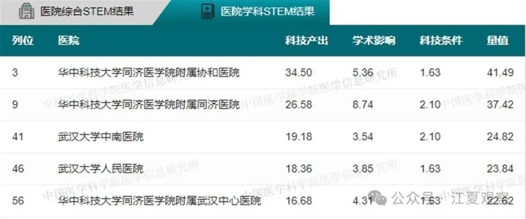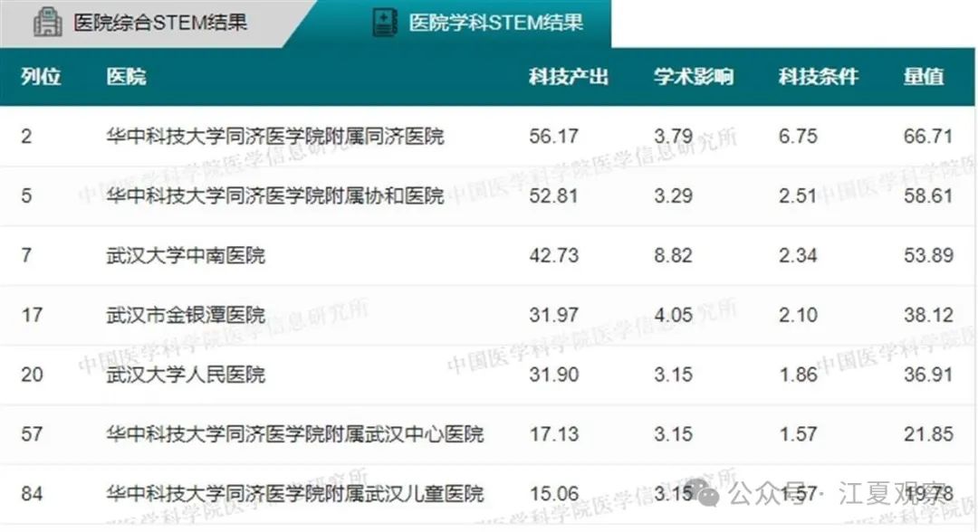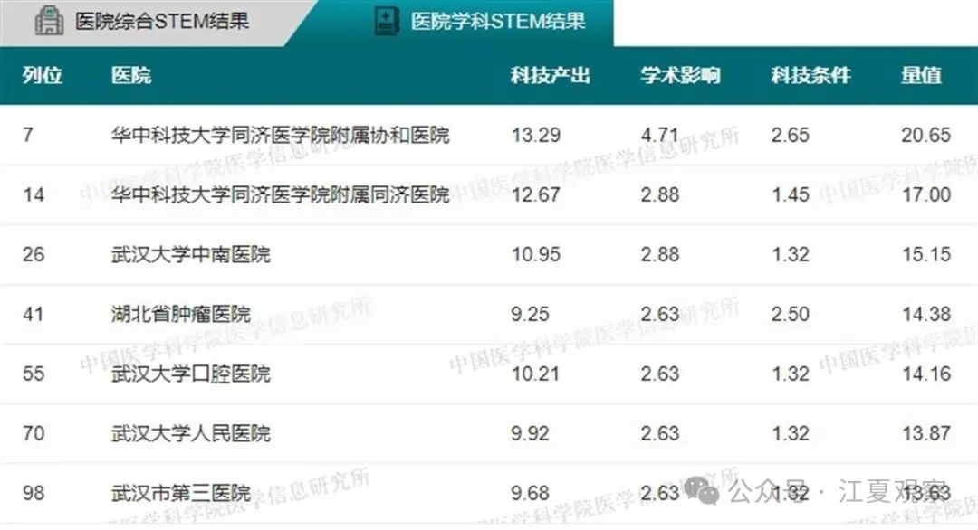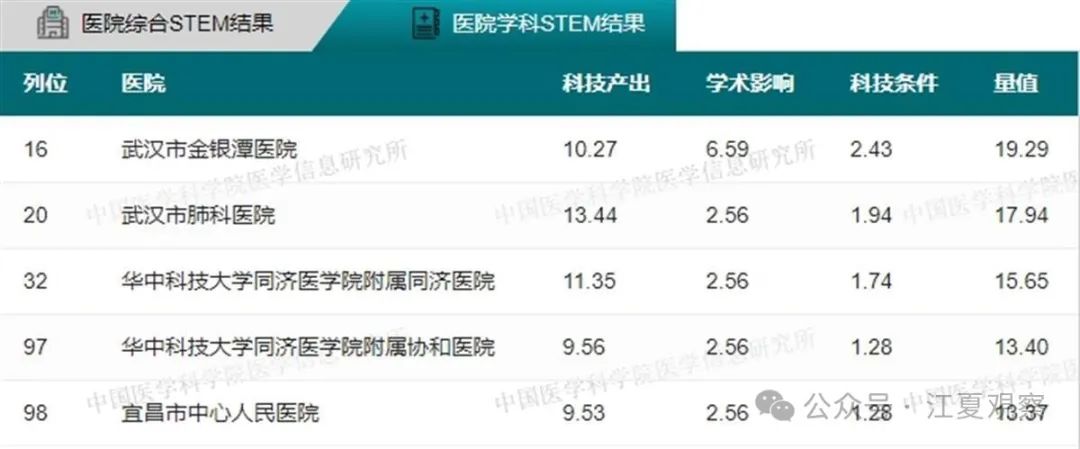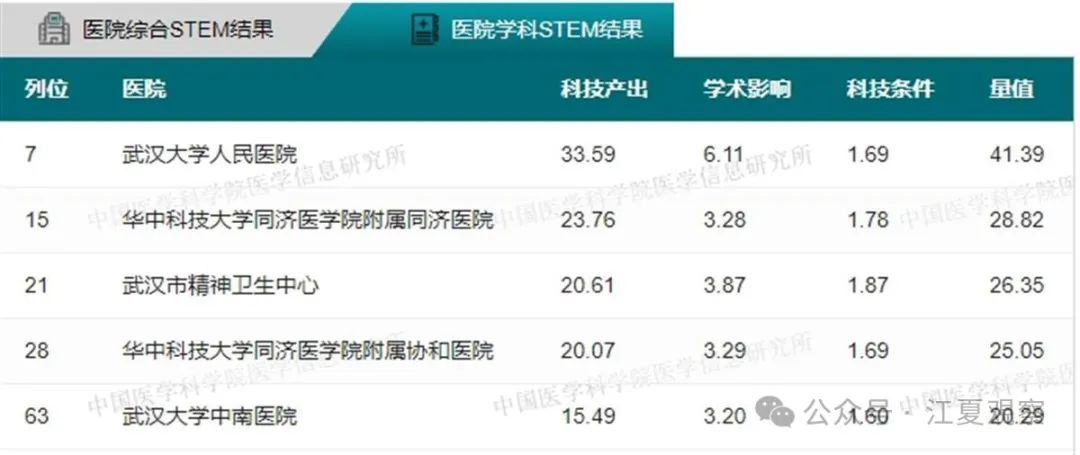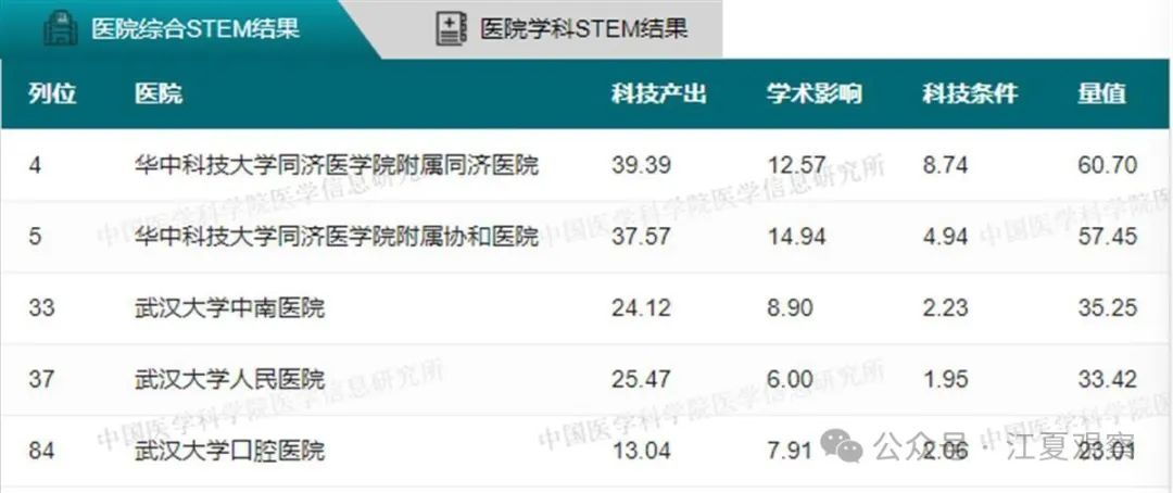 2023年度中国医院科技量值(综合)前100名武汉有5家医院上榜:华中科技大学同济医学院附属同济医院、华中科技大学同济医学院附属协和医院、武汉大学中南医院、武汉大学人民医院、武汉大学口腔医院。