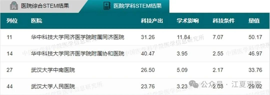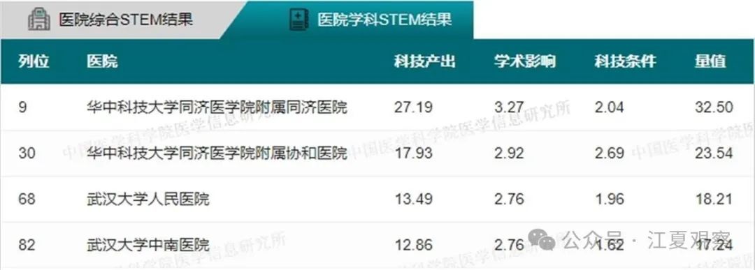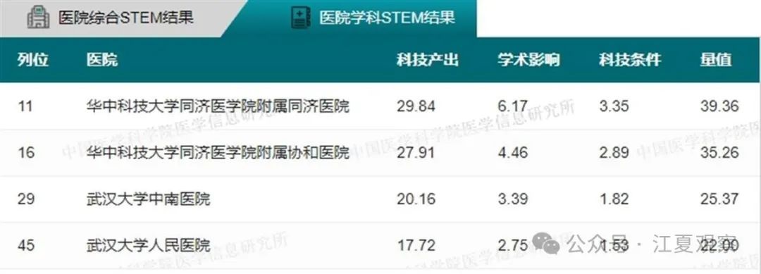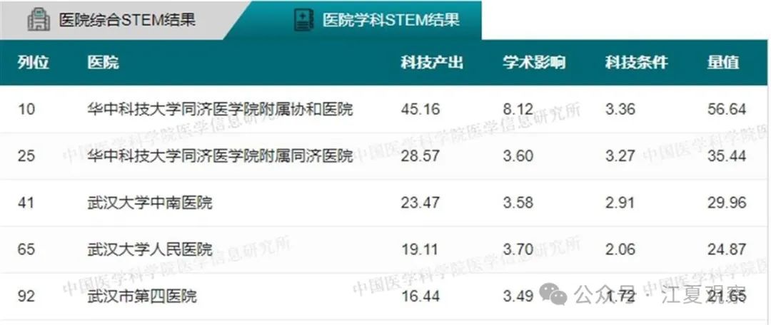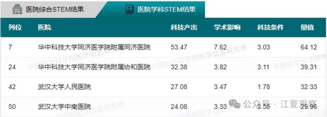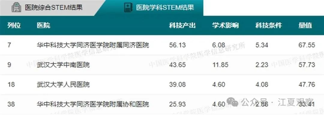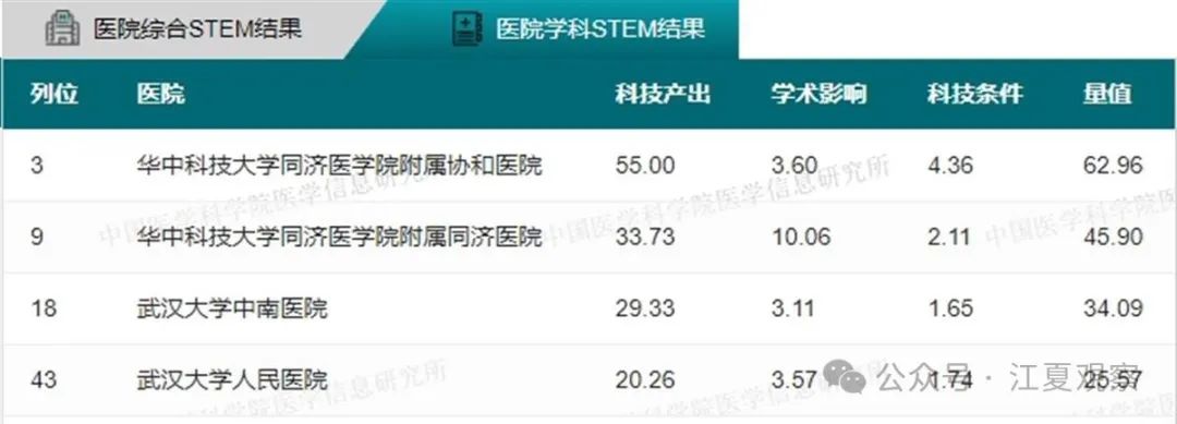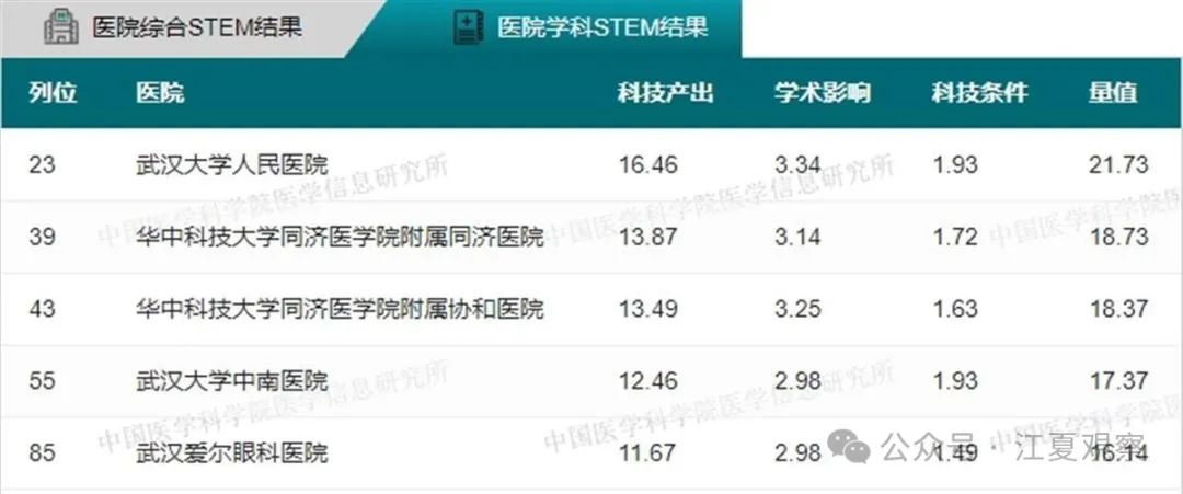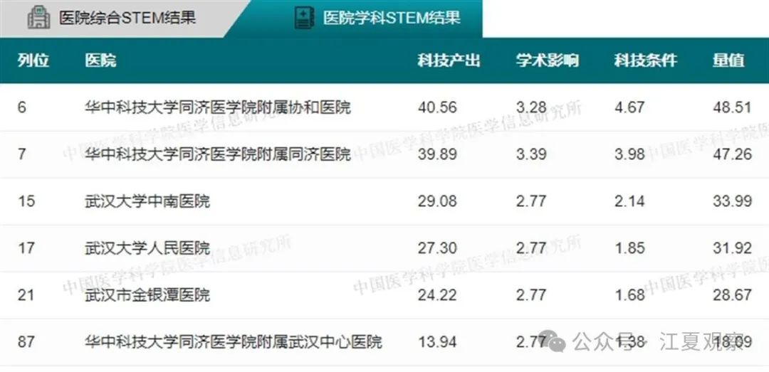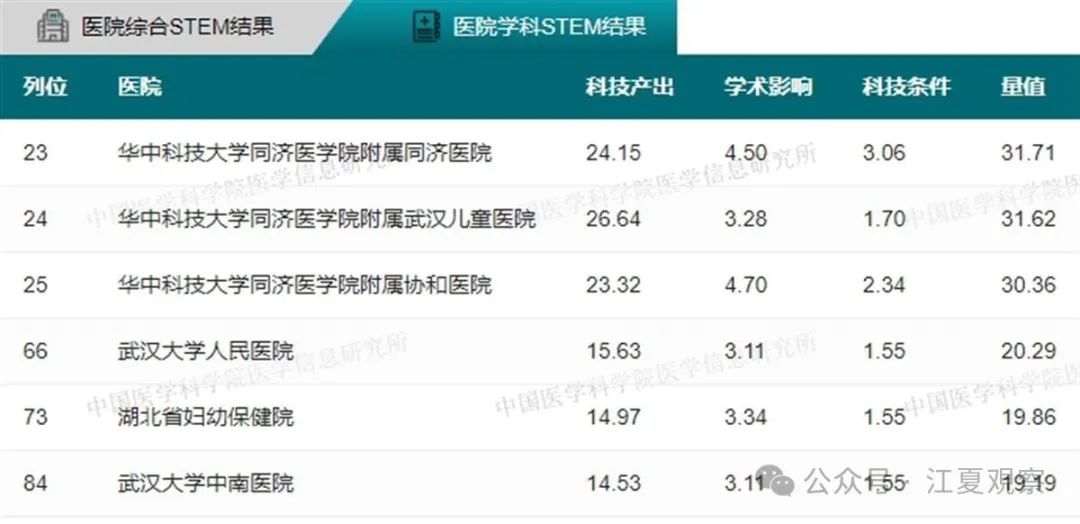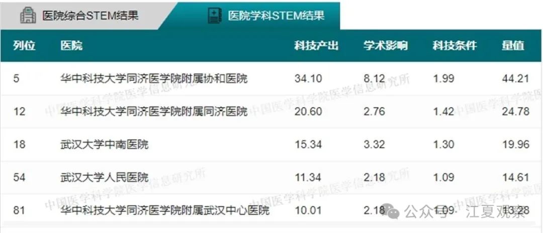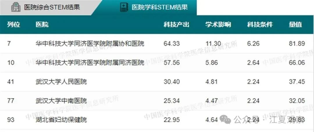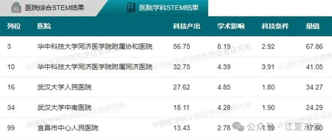 2023年度中国医院科技量值(综合)前100名武汉有5家医院上榜:华中科技大学同济医学院附属同济医院、华中科技大学同济医学院附属协和医院、武汉大学中南医院、武汉大学人民医院、武汉大学口腔医院。