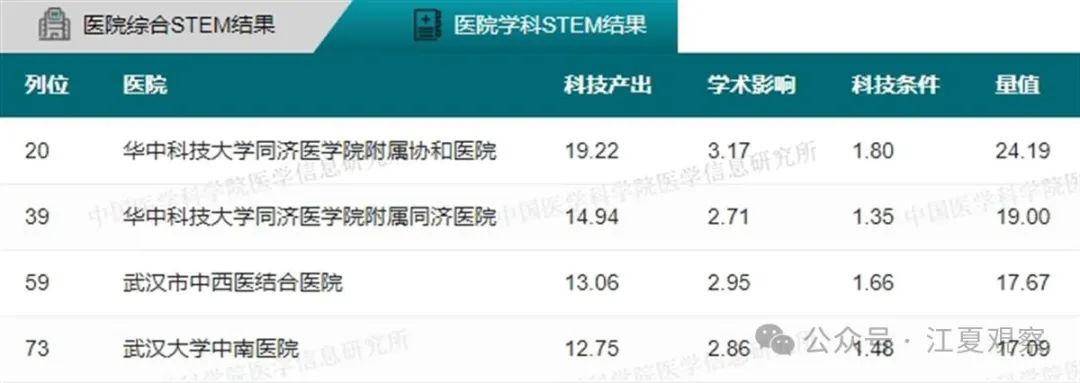 2023年度中国医院科技量值(综合)前100名武汉医院上榜情况