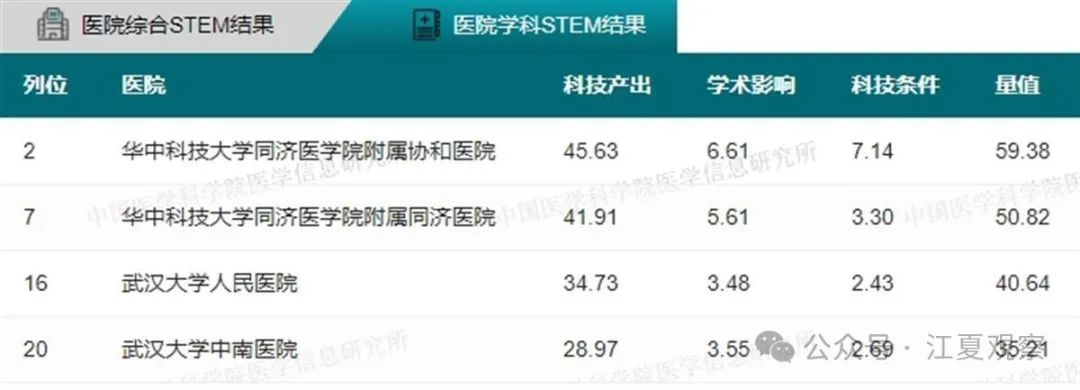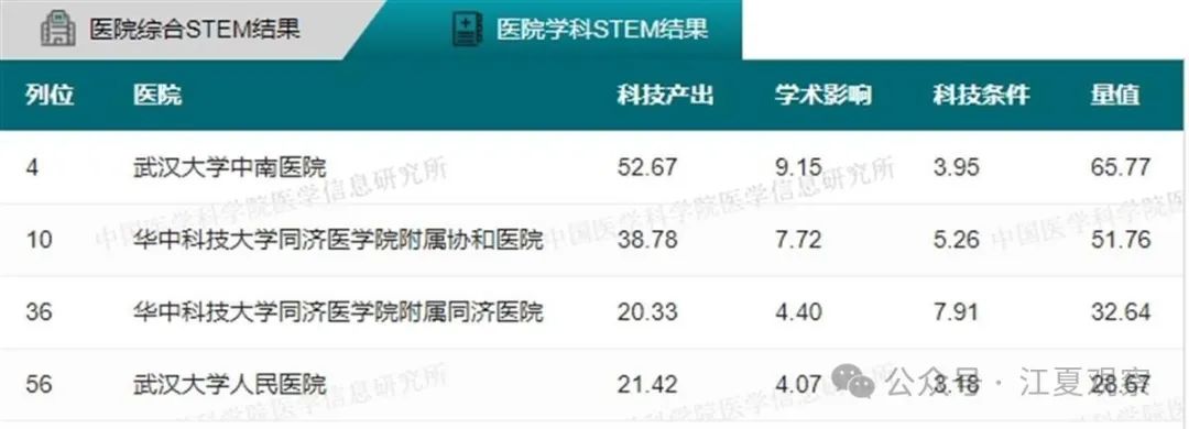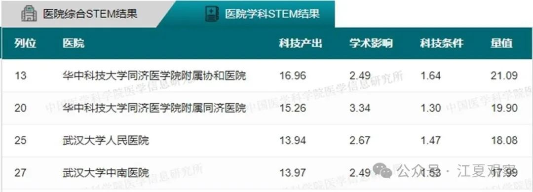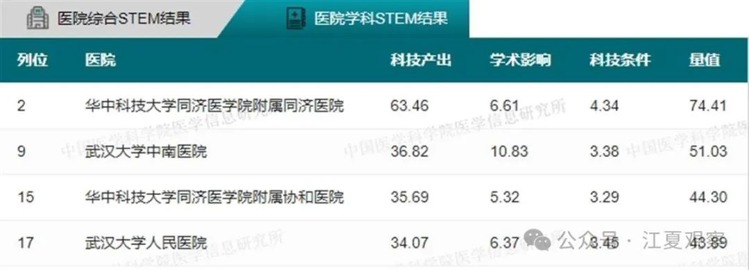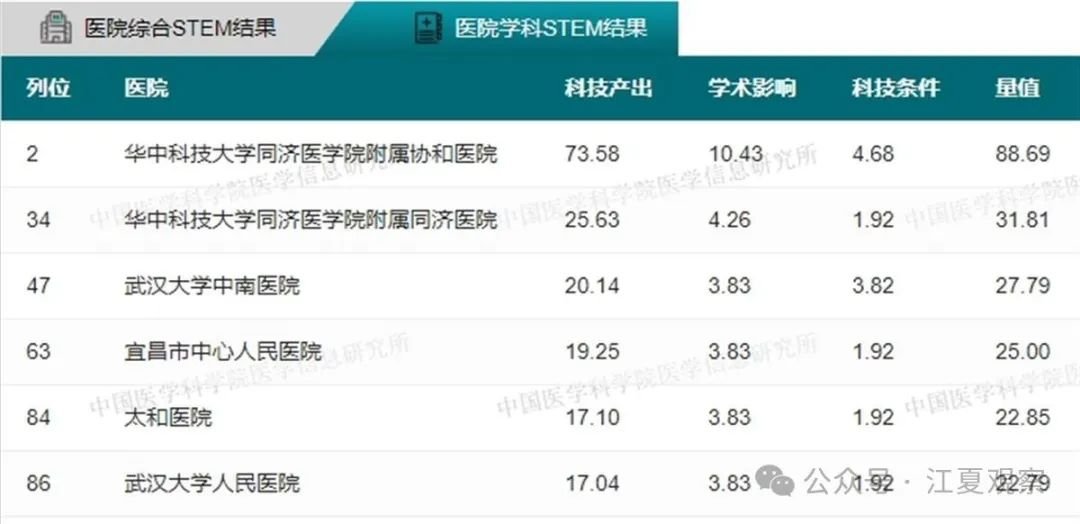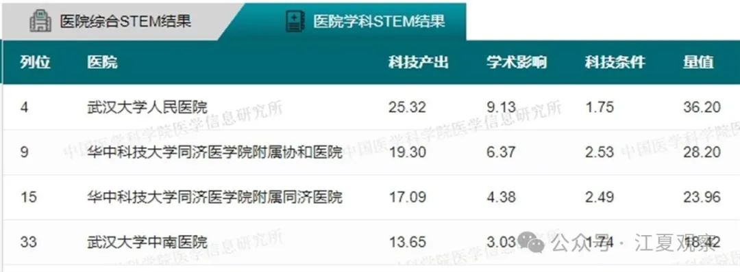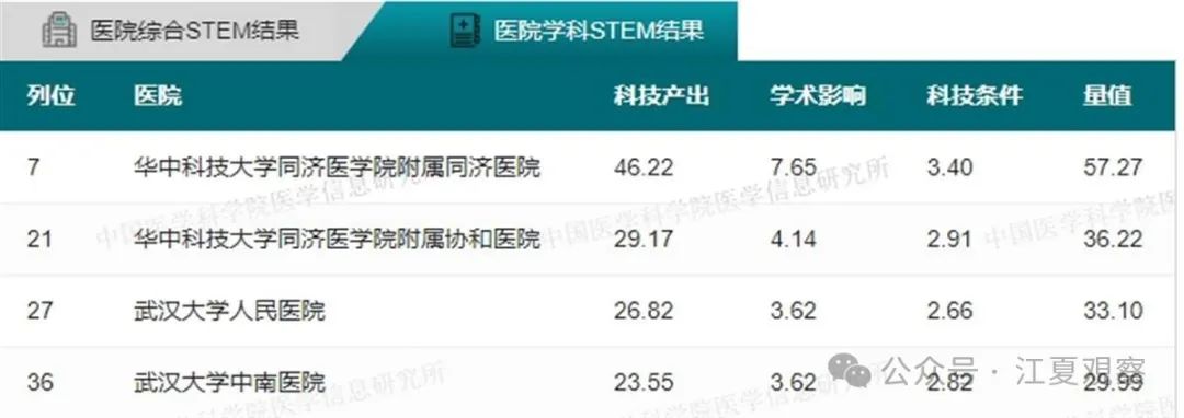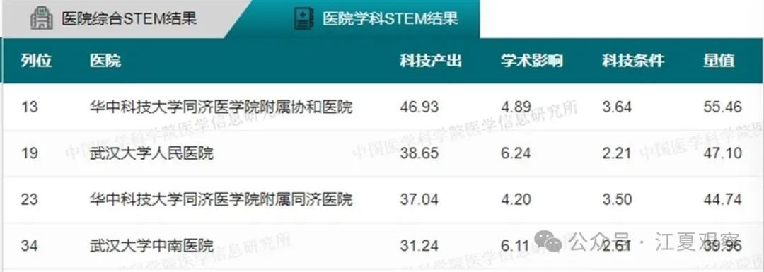 34个学科全国前100名武汉医院上榜情况