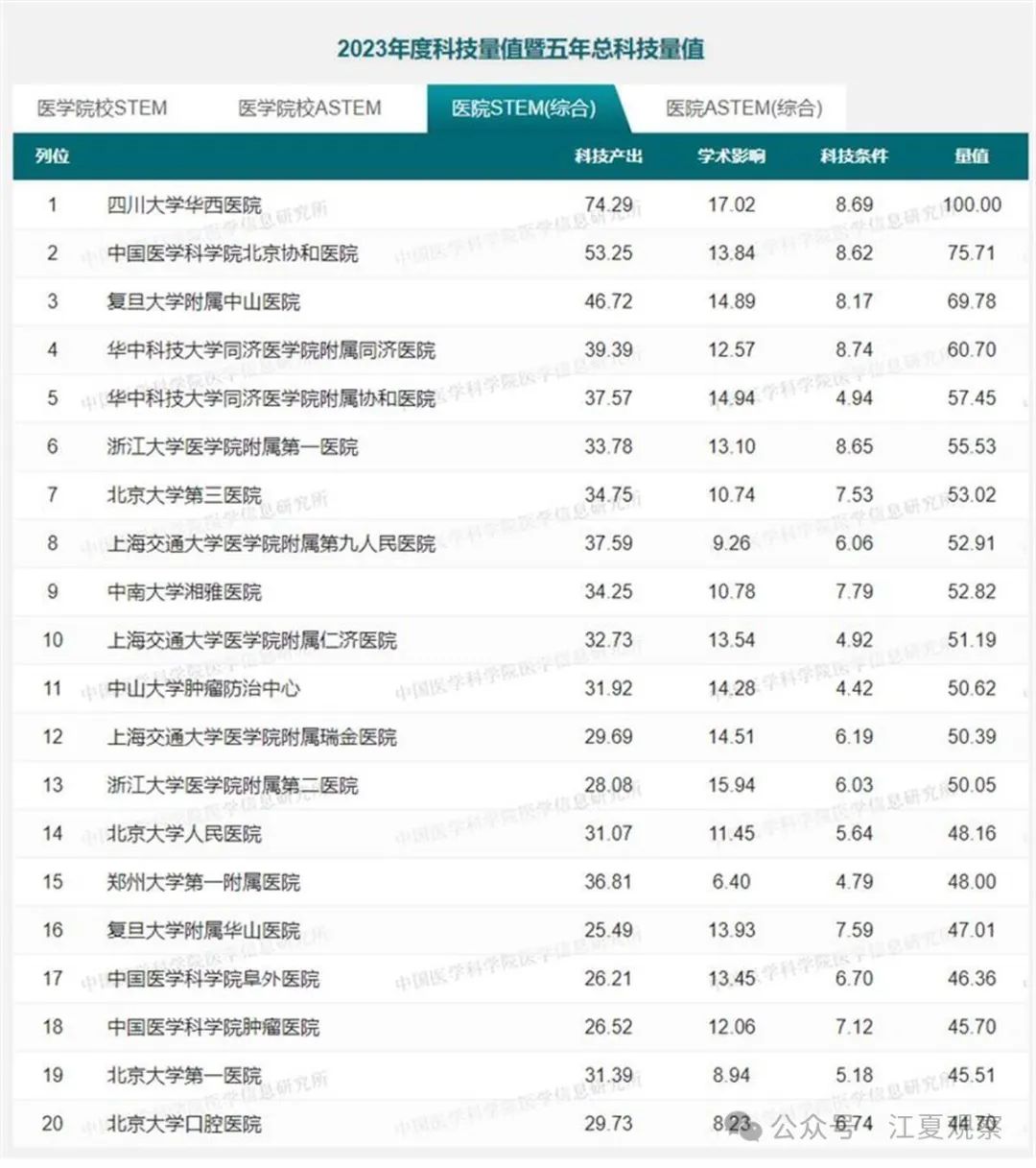 7月19日,2023年度中国医学院校/中国医院科技量值(STEM)暨2019-2023五年总科技量值在北京发布。科技量值是围绕科技活动全过程,主要从科技产出、学术影响、科技条件三方面得出的综合测算值,体现了医学院校和医院的科技创新力和临床研究能力。