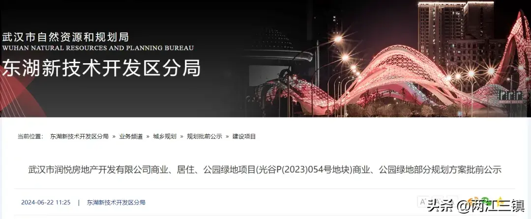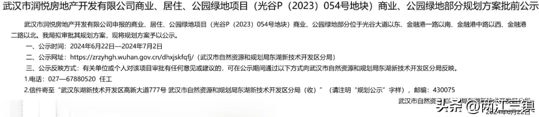 6月22日,武汉市自然资源和规划局发布了《武汉市润悦房地产开发有限公司商业、居住、公园绿地项目(光谷P(2023)054号地块)商业、公园绿地部分规划方案批前公示》。