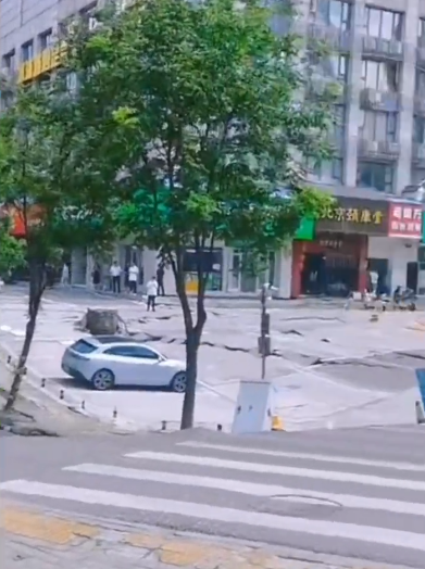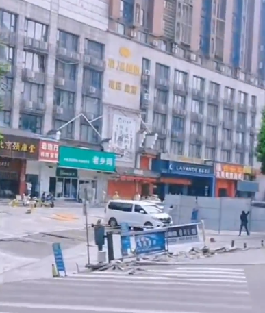 现场视频显示,城市道路发生大面积塌陷,部分塌陷面积离附近建筑不远,且附近有施工围挡,疑似此前有施工。