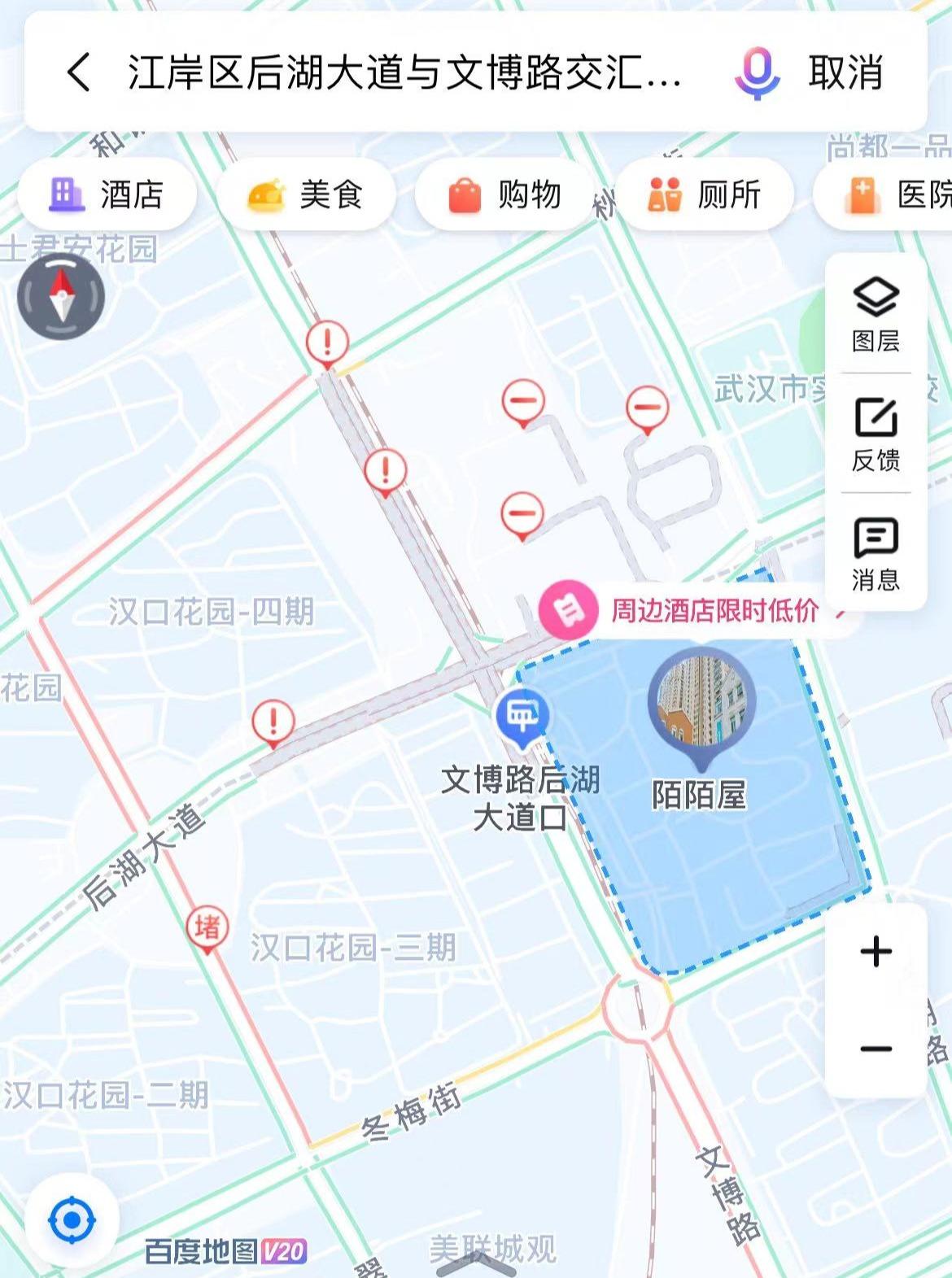 8月1日晚,潇湘晨报(报料微信:xxcbbaoliao)记者查看百度地图发现,武汉市江岸区后湖大道与文博路交汇处发生道路险情。