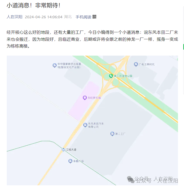 其实小编早在今年4月份的时候就发布过一则小道消息。如今看来这个消息可信度还是蛮高的,估计不久的将来经开区也会发布东风本田二厂所在地块的用地性质变更的公告,拭目以待。