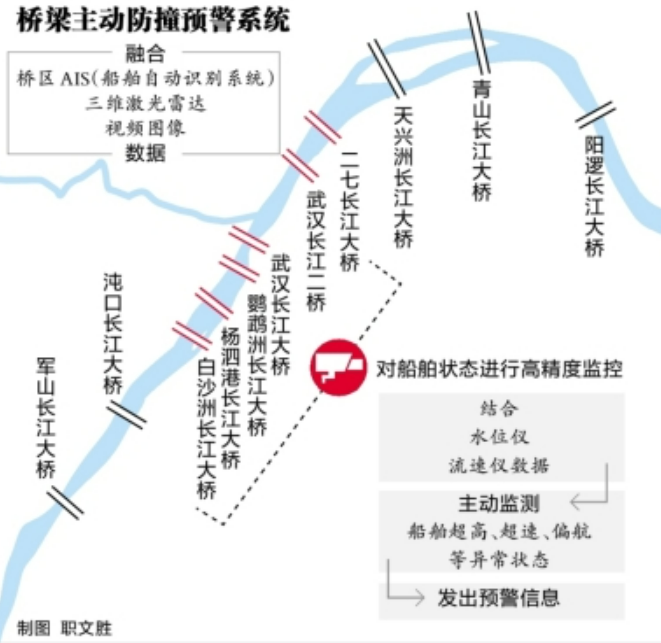 2020年,青山长江大桥率先建成了主动防撞预警系统,是长江武汉段第一座安装主动防撞预警的桥梁。其通过雷达、激光、视频、AIS等数据对船舶状态进行监控和分析,一旦发现船舶存在超高、偏航等危险行为,系统将立即发出预警,海事部门可迅速介入,对船舶进行安全提醒,可有效预防船舶碰撞桥梁事故发生。