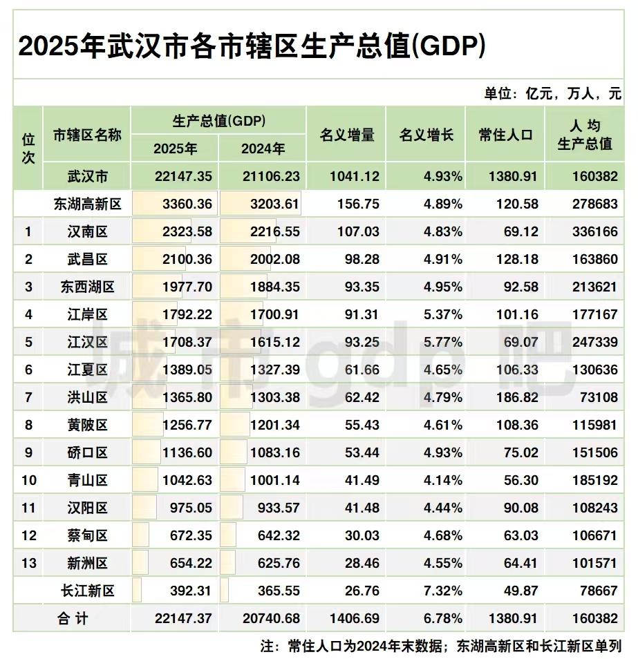 武汉各区县2025年GDP出炉:东西湖区接近2000亿、江夏区洪山区相当、汉阳区接近一千亿 武汉是我国经济十强城市之一,2025年GDP实现22147.37亿,较2024年增加了1406.69亿,名义增长6.78%,武汉常住人口1380.91万人,人均GDP实现160382元。 从各区县名义增速来看,长江新区名义增速最高,同比增长7.32%,青山区名义增速处于垫底,同比增长4.14%,东西湖区2025年GDP总量接近二千亿,实现1977.7亿,位居全市第3名。 江夏区和洪山区2025年GDP总量相当,分别实现1389.05亿和1365.8亿,较2024年分别增加了61.66亿和62.42亿。 汉阳区2025年GDP总量接近一千亿,实现975.05亿,较2024年增加了41.48亿,名义增长4.44%。