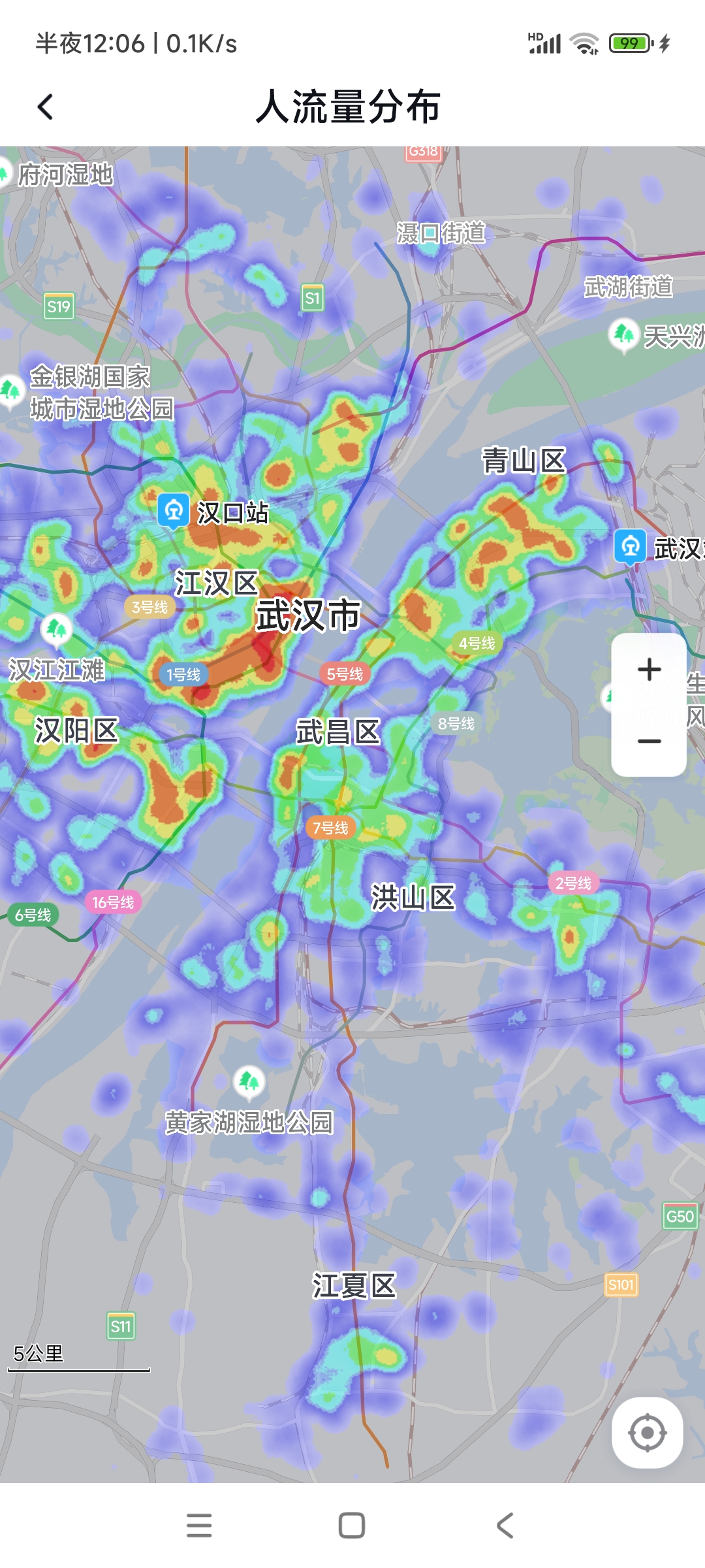 初一武汉半夜人流量分布图,汉口密度最高,汉阳排第二,青山排第三,武昌排第四。
