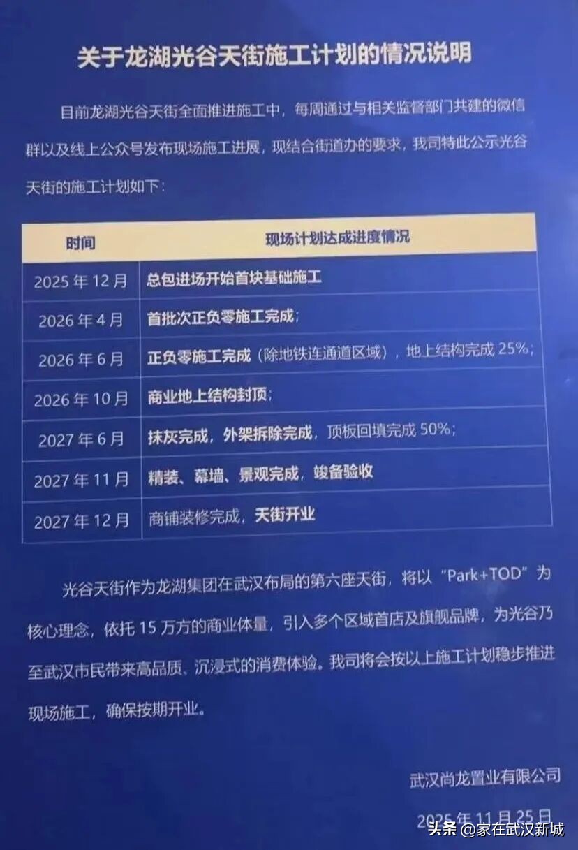据悉,龙湖光谷天街位于高新二路与光谷五路黄金交汇点,总建筑面积达20万平方米。项目于2025年5月开工,计划2027年12月盛大开业。