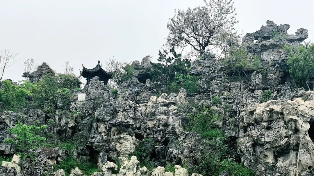 泡桐树的正前方,就是假山,走近才发现,这座假山规模不小,依地形而建,左右横亘几十米,从山脚至山顶,略估摸有两三层楼高,假山上有一六角仿古亭,还有石洞数孔,小朋友应该比较喜欢。山上有假石堆叠的小道,有点陡峭,下雨天路滑,行走需非常小心。