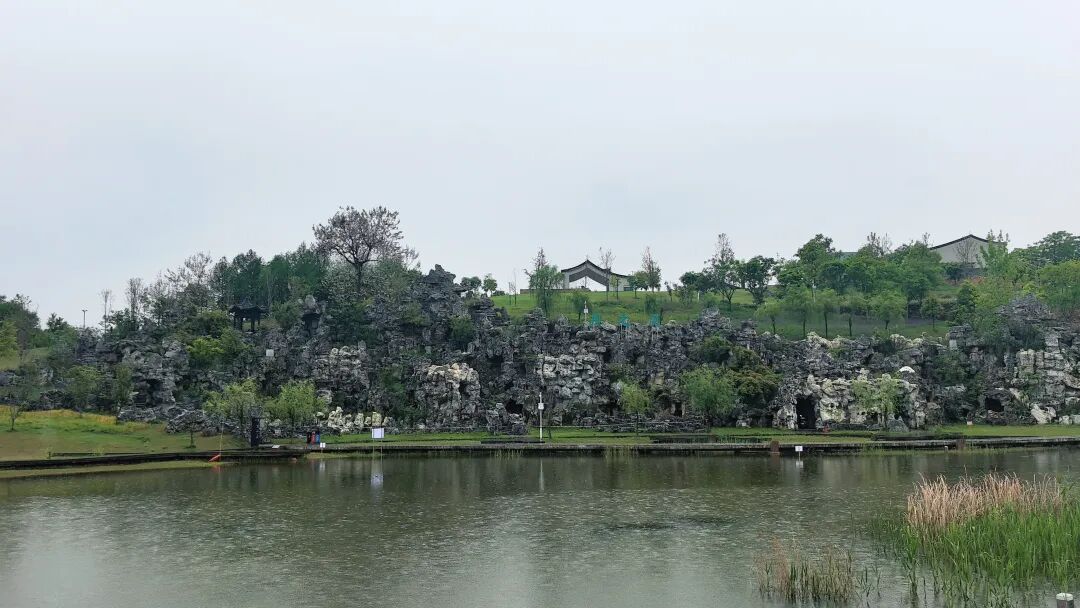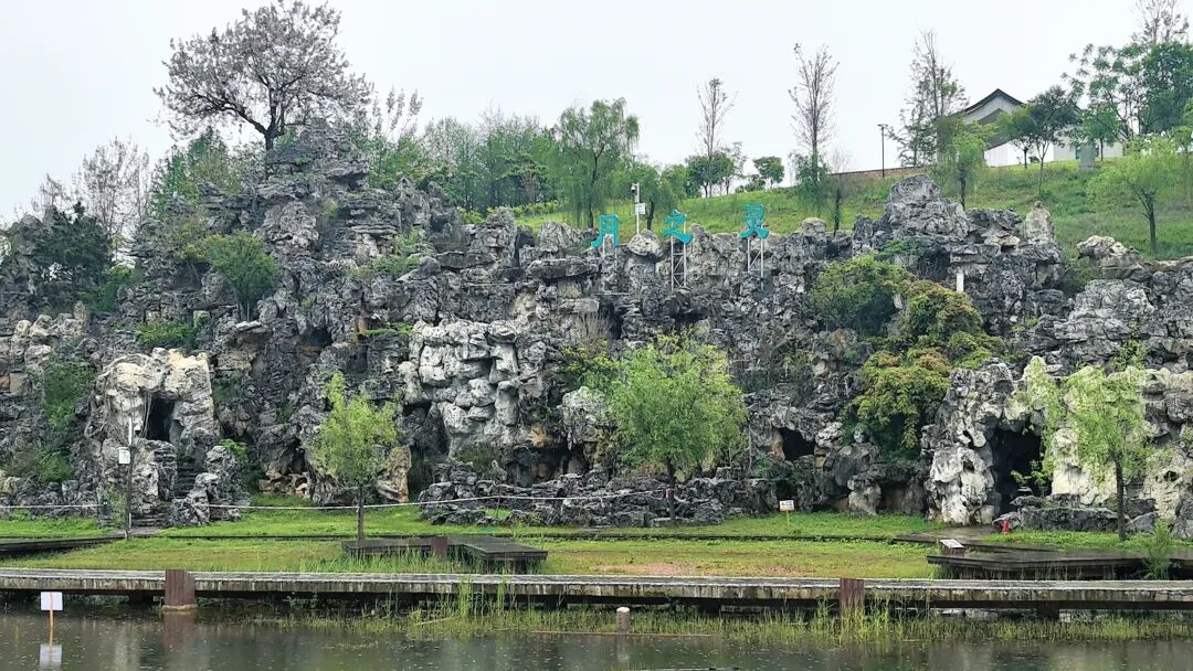 从假山上下来,就到了浅湖边,湖边有木栈道,可以近观湖景,应该是亲水平台,沿着木栈道,走到浅湖对岸的绿道景观桥上回看,假山上挂了几个大字,月之灵。