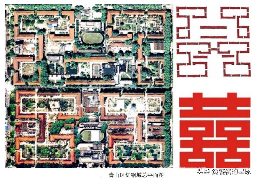 1956 年建成的第一批红钢城工人住宅——蒋家墩 8、 9、10 街坊具有十分明显的苏式风格。从整体上看,居住区采用“街坊式”,每个街坊由几组沿道路周边布置的居民楼组成,居民楼中间形成合院,合院中是宽敞的绿地。居民楼呈三面或四面围合布局,通过开口方向 的组织在总平面上构成“囍”字形图案,具有极强的形式感和秩序感。