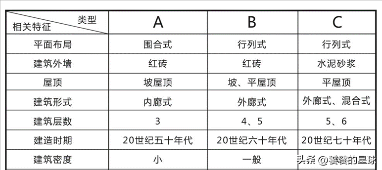 早期的街坊容积率较低,主要为 3 层砖木混合式结构,双坡红瓦屋顶和清水红砖墙面。建筑平面仿苏联集合住宅的短内廊组合,采用短内廊带转角的一梯三户组合。由于照搬苏联寒冷地区的建筑形式,布局完全没有规避东西朝向,导致开窗面积小、室内采光通风较差、日照时间不足,反映了典型的“形式大于功能”的设计思路。
