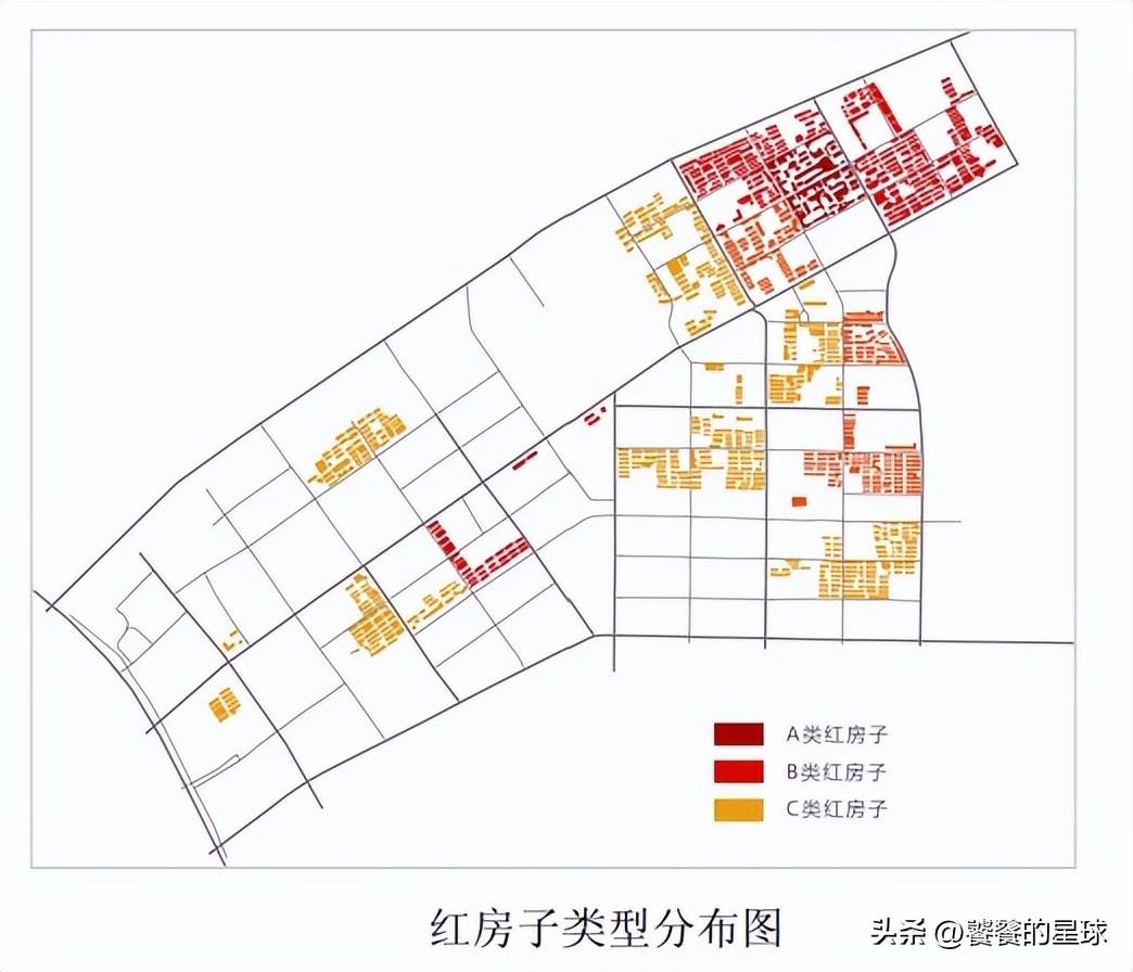 A 类红砖坡屋顶建筑主要集中在 3 到 9 街坊,是年限使用最长建筑特色最为突出的片区。B 类红砖平屋顶建筑分布在 20-27 街坊,建筑样式都为外廊式,风格较为统一,具有普遍代表性。C 类水泥砂浆建筑则主要分布在 25-30 街坊,建筑通常为 4-6 层,建筑密度较大,是外廊式与混合式并的街坊,红房子的特征逐渐变弱。