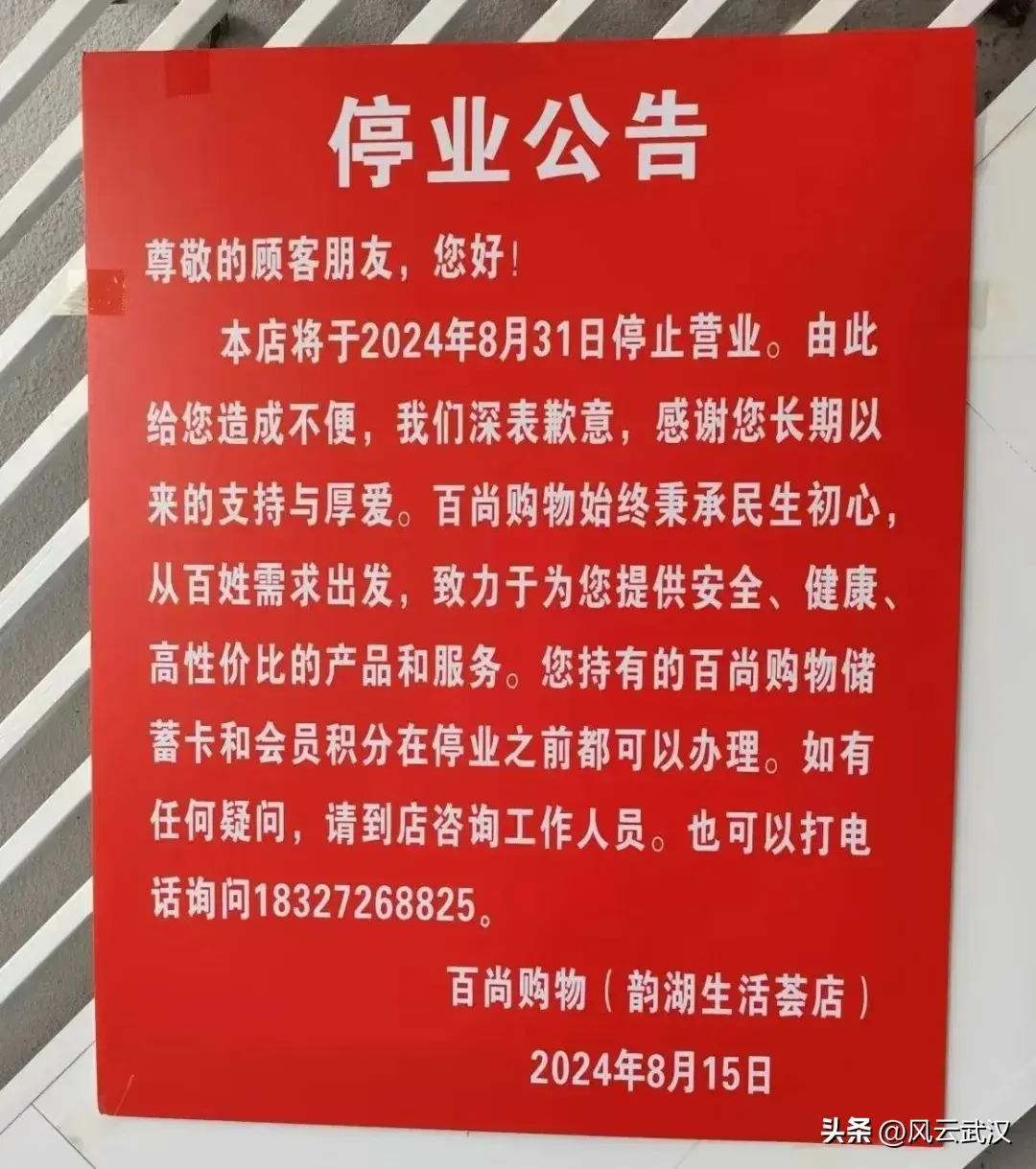 2024年8月15日,百尚购物(韵湖生活荟店)发布停业公告,宣布将于8月31日停止营业!(后又恢复营业)