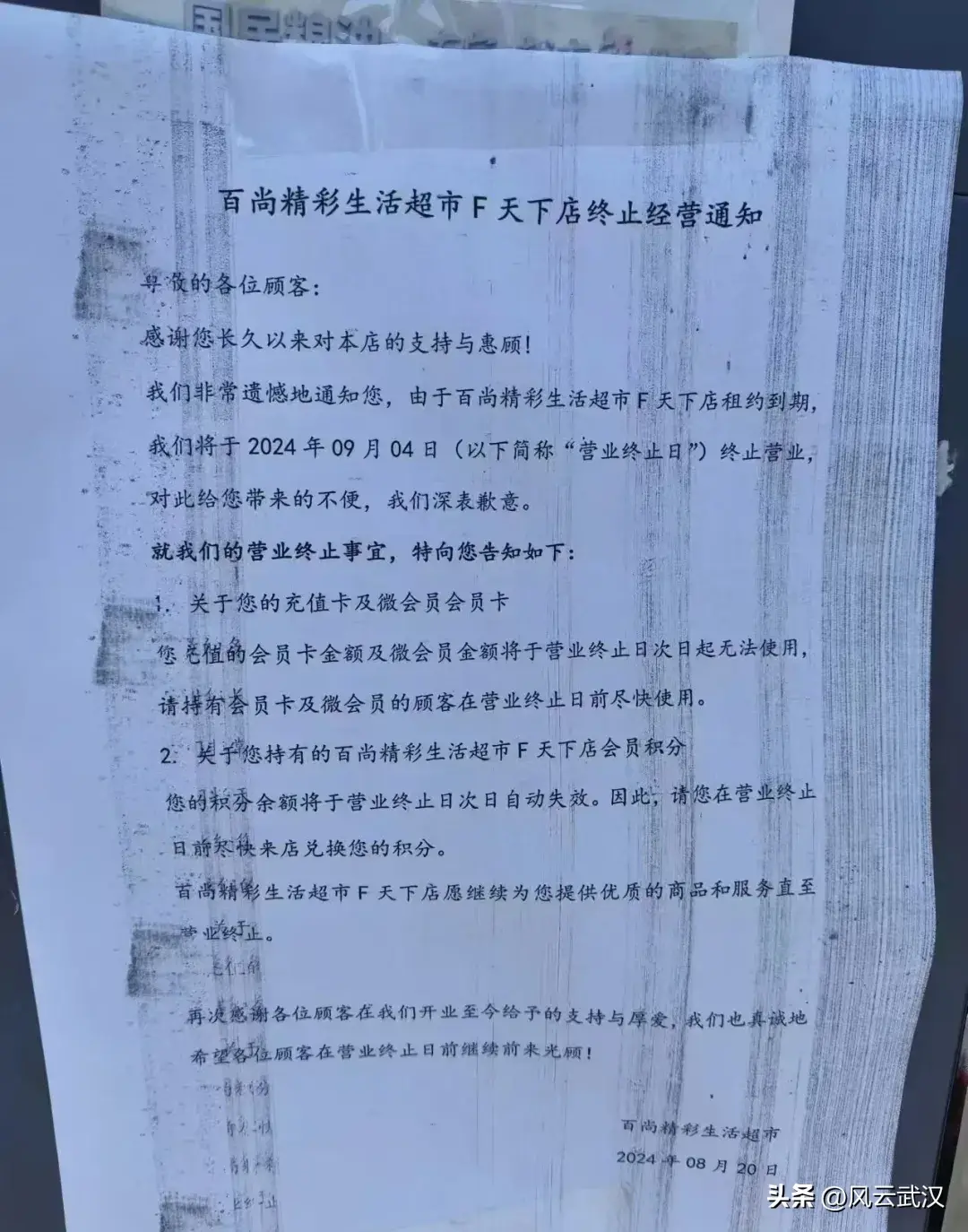 2024年8月20日,百尚精彩生活超市F天下店发布终止经营通知。该超市于2020年底开业,营业至今还不到4年。