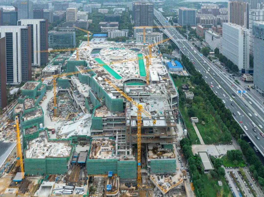 日前,武汉光谷万象天地项目正式封顶,进入内部精装土建施工阶段。自国庆中秋假期以来,数百名建设者紧锣密鼓推进工程进度,全力冲刺2026年下半年开业。