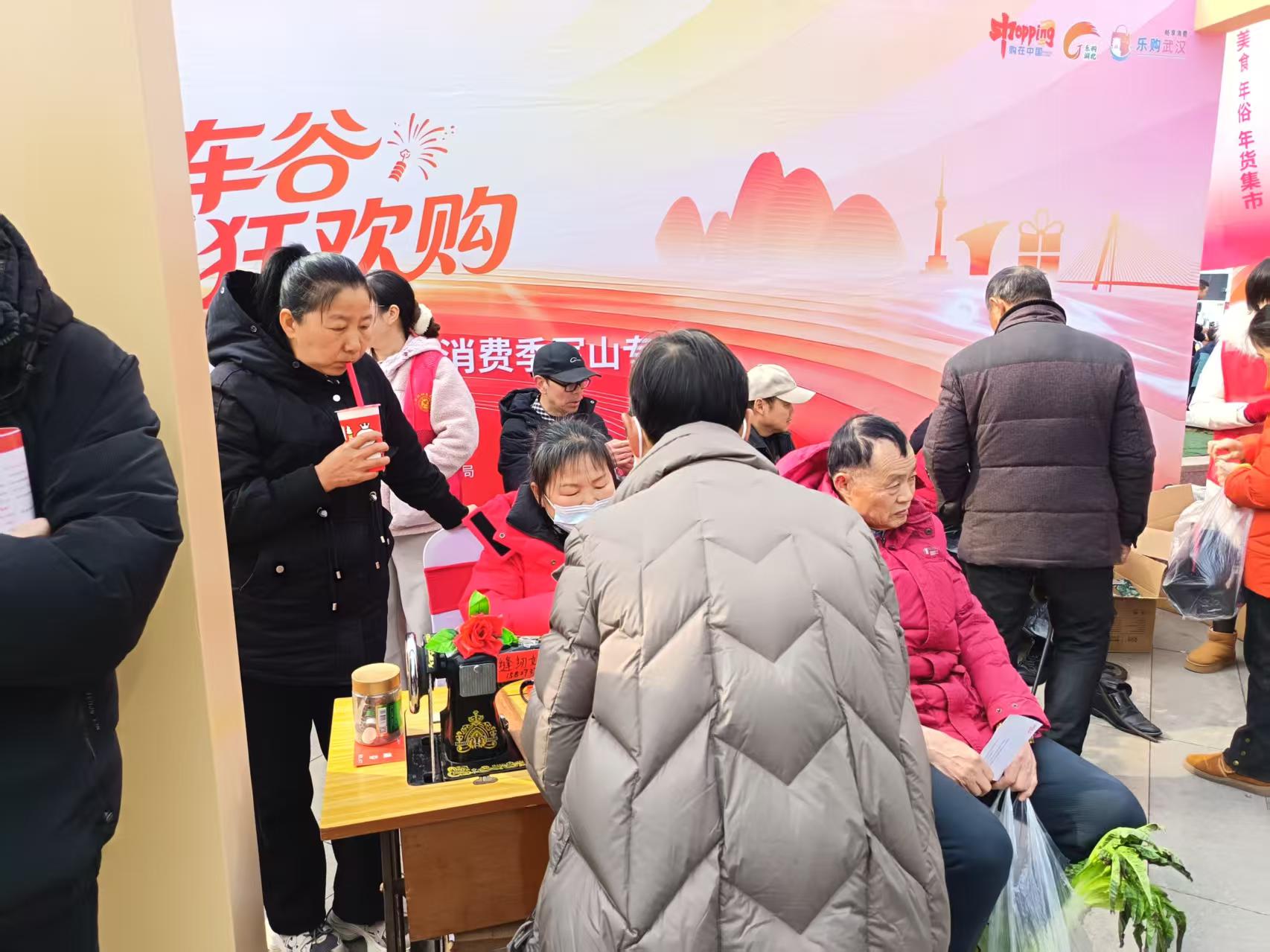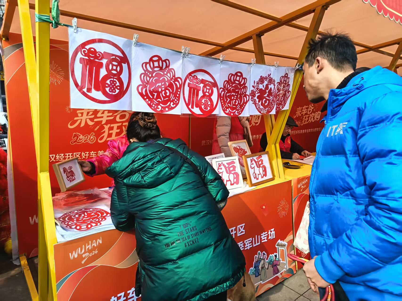 武汉经开区军山新城副主任习涛介绍,现场设置了几大类,非遗展示区设置有吹糖人、画糖画、捏面人、剪纸等摊位;年货区引入本土特色品牌,集中入驻30余家优质商户,有现炸得胜圆子、酥鱼、豆丝特色产品销售;展车区集中展示岚图、猛士、东本、奕派、吉利、小鹏等品牌汽车,提供“看车-咨询-购车”一站式服务。活动还提供理发、修鞋、写春联送祝福等便民服务。