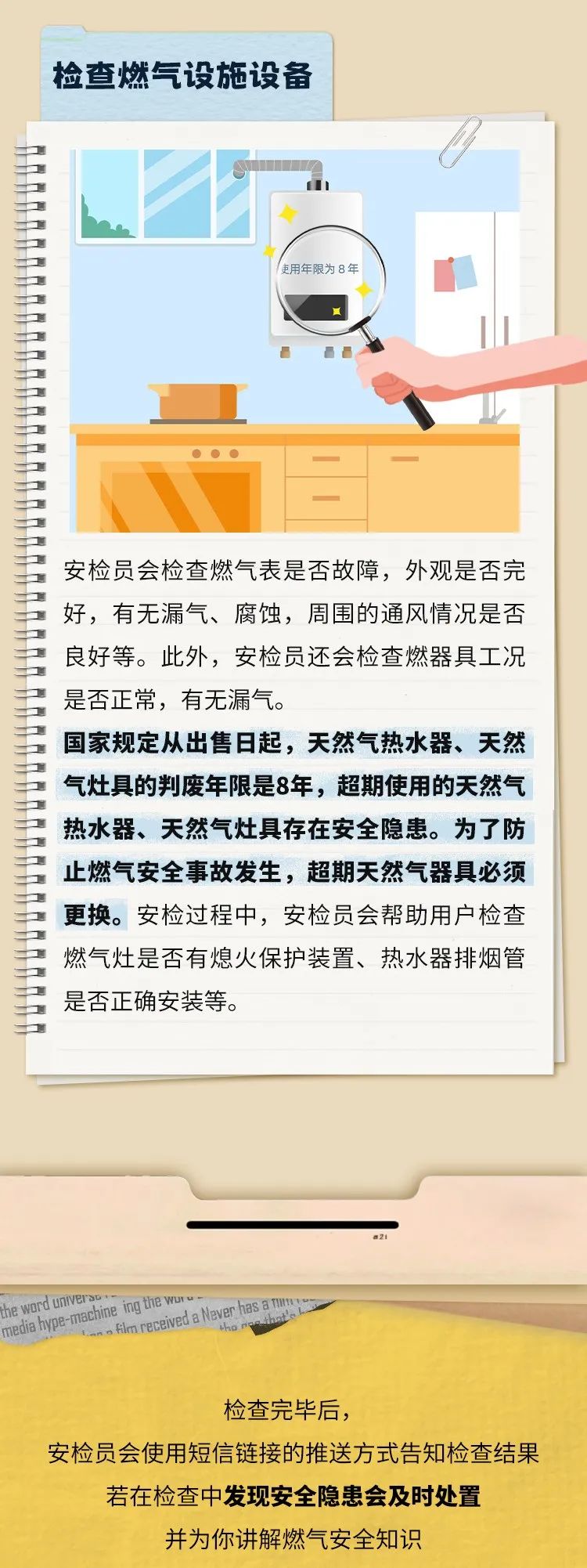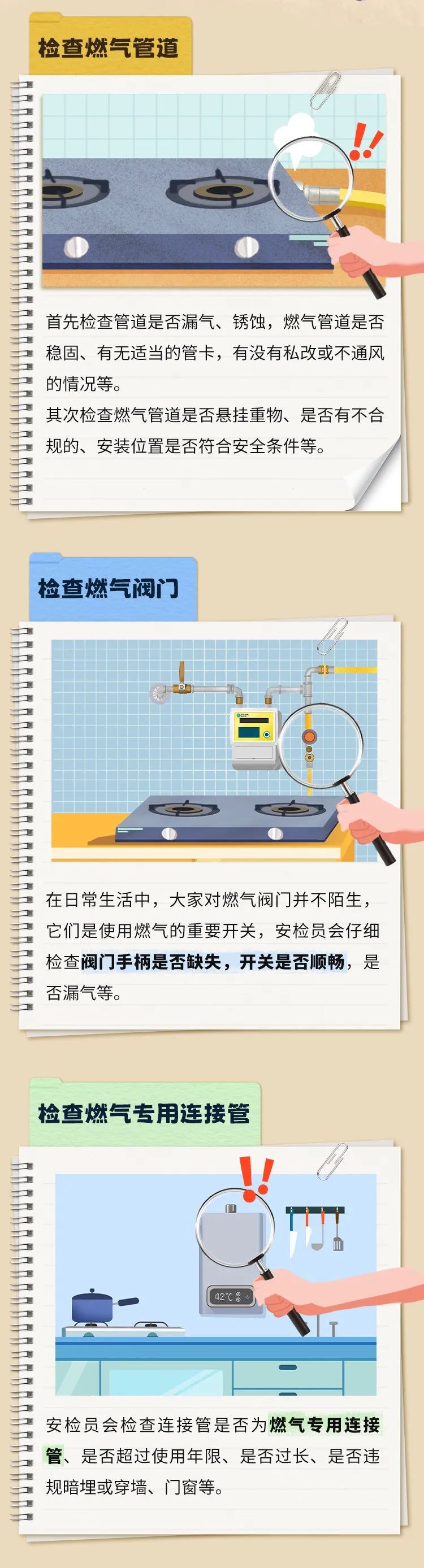 市燃气集团提醒市民多多留意小区安检公告,根据安检的时间提前留人在家等候,配合入户安检,了解燃气安全注意事项。
