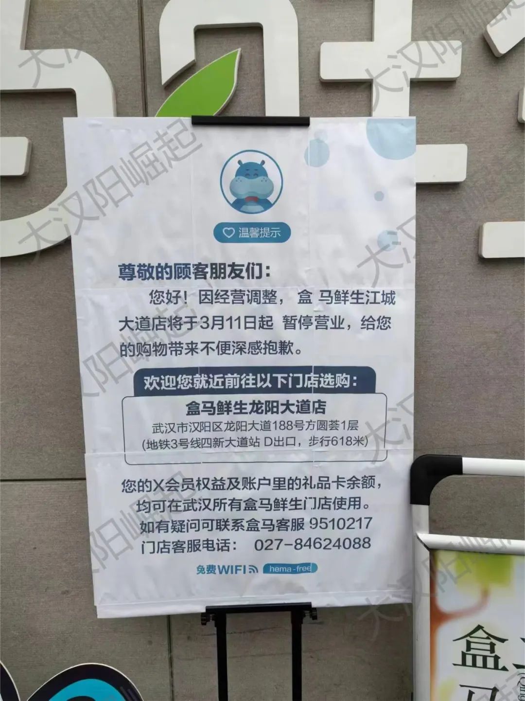 位于汉阳江城大道绿地中央广场商业楼的盒马鲜生江城大道店,将于3月11日停止经营,官方已经发布了正式公告!